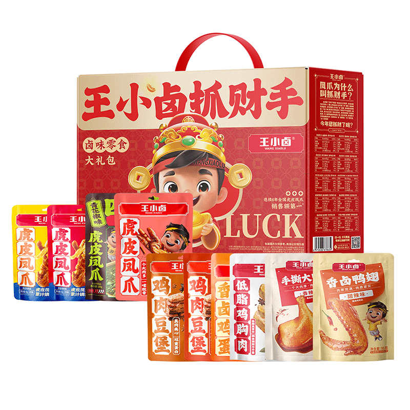王小卤鸡爪一嗦脱骨肉厚筋多;王小卤新版财神送元宝IP形象,与抓财手主题更加契合;大面积烫金+Uv,亮哑结合,品质感更高,特种纸张,