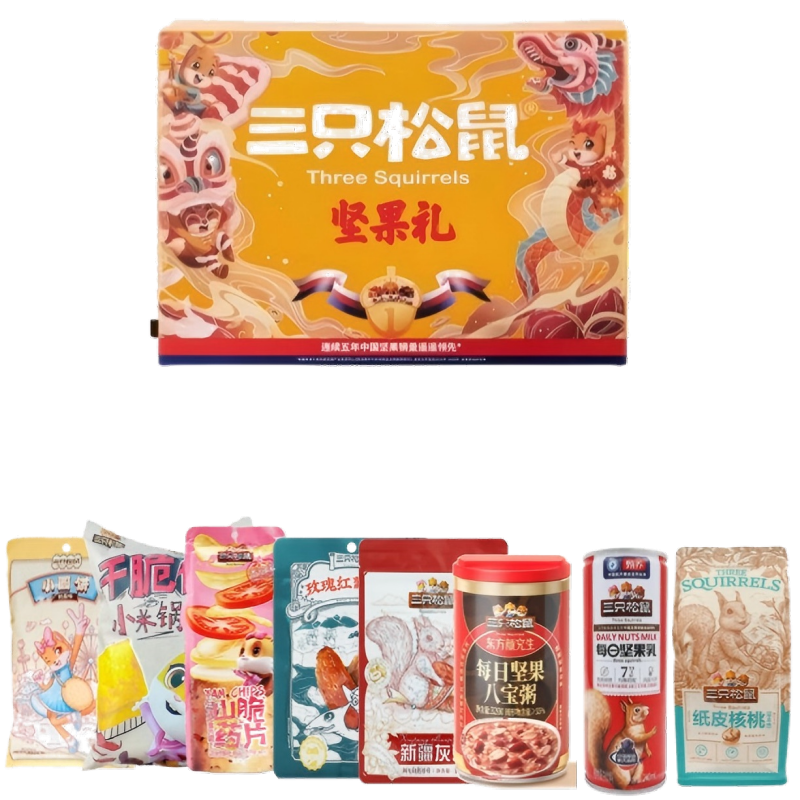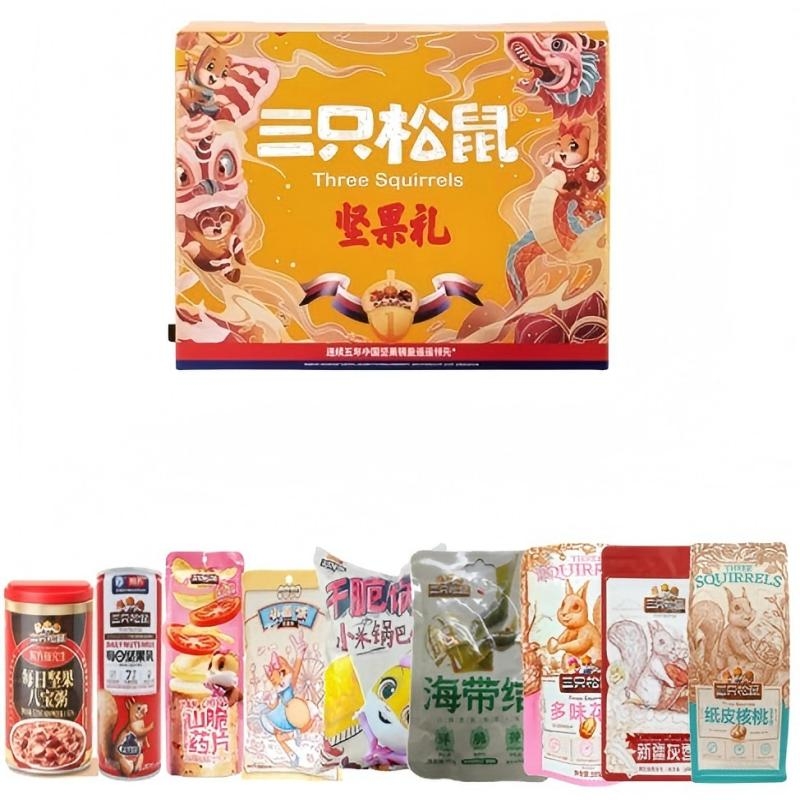 三只松鼠是大品牌,质量安全、品质保证,吃的放心。;礼盒内配品类丰富,各种坚果零食都有,性价比高。;礼盒设计精美,包装大气喜庆,值得购买。