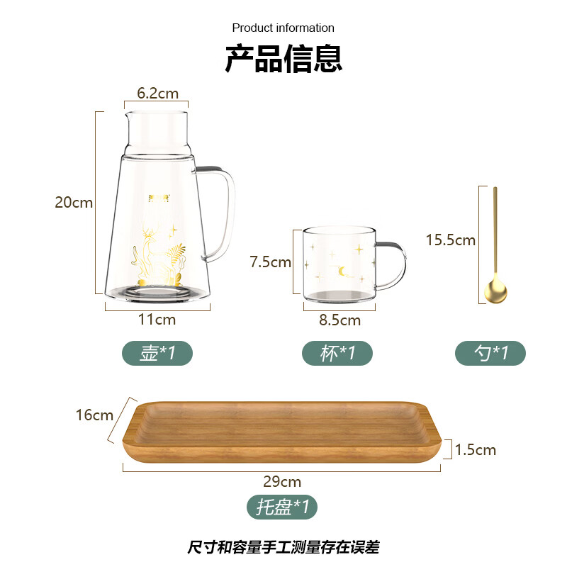 配置清单:凉水壶1200ml*1 、水杯杯400ml*1、不锈钢勺*1、胡桃木托盘*1