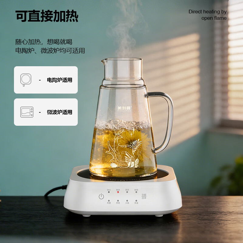 耐冷热瞬时温差-20℃-170℃,杜绝污渍和异味;一壶一杯分体式两用壶盖设计,精致烤花;玻璃采用纯手工吹制,一体成型,使用明火或电陶炉加热