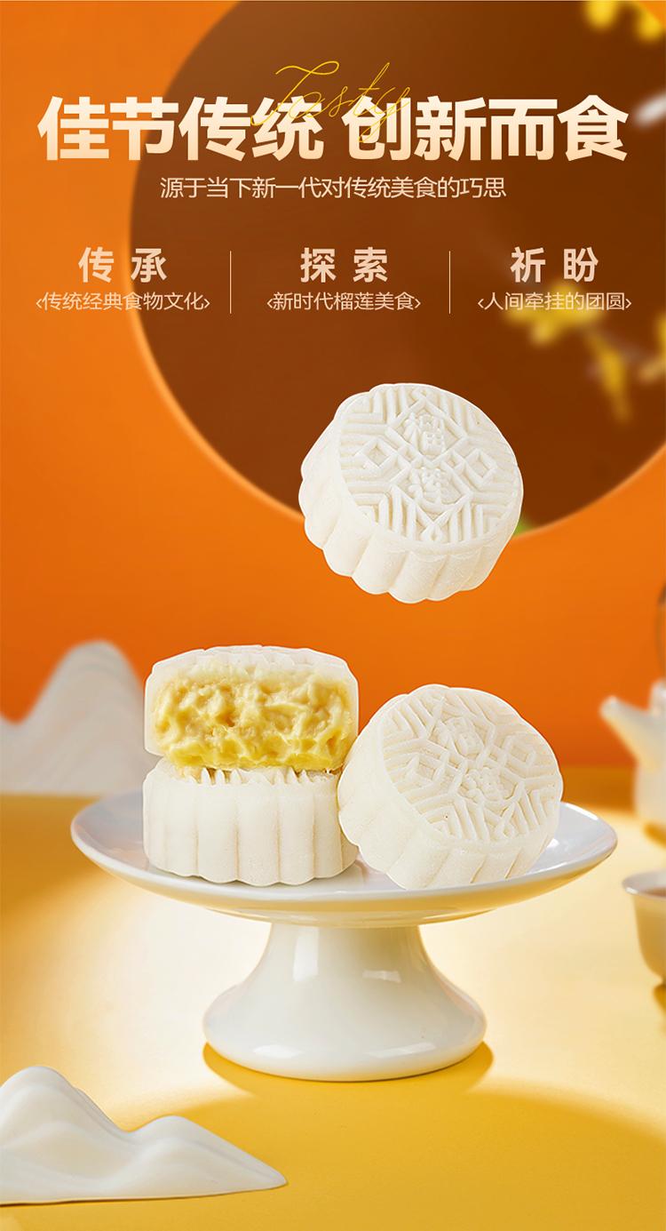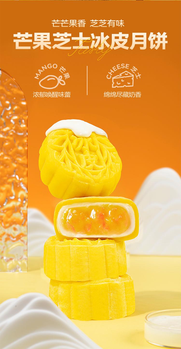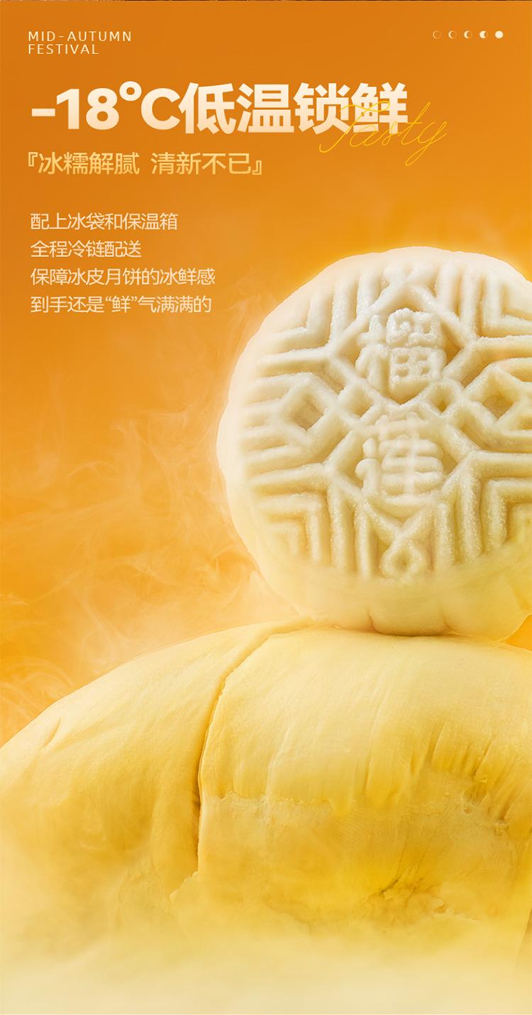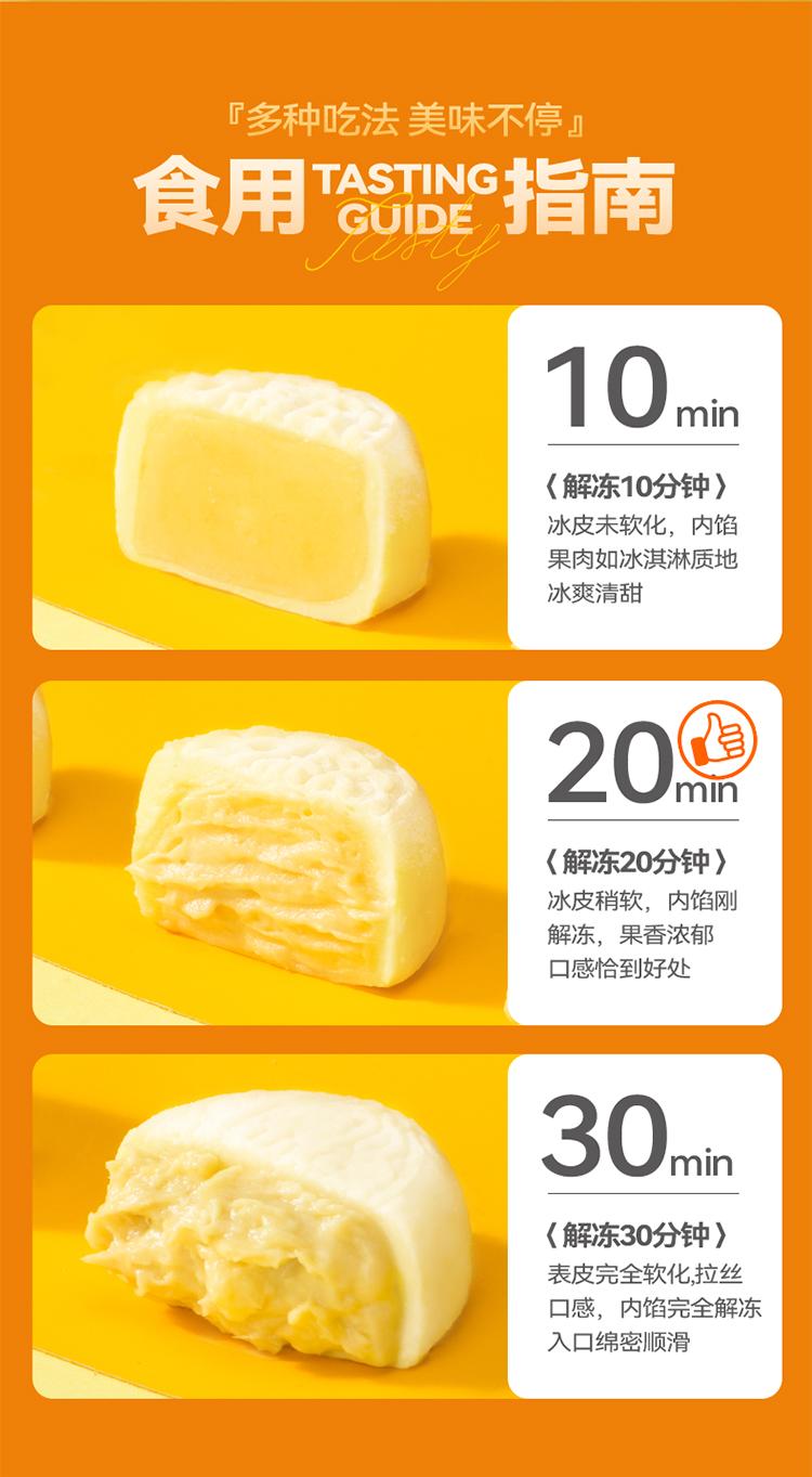口味:榴莲冰皮月饼100g*2枚 、 芒果芝士冰皮月饼100g*2枚 、 生椰拿铁冰皮月饼100g*2枚