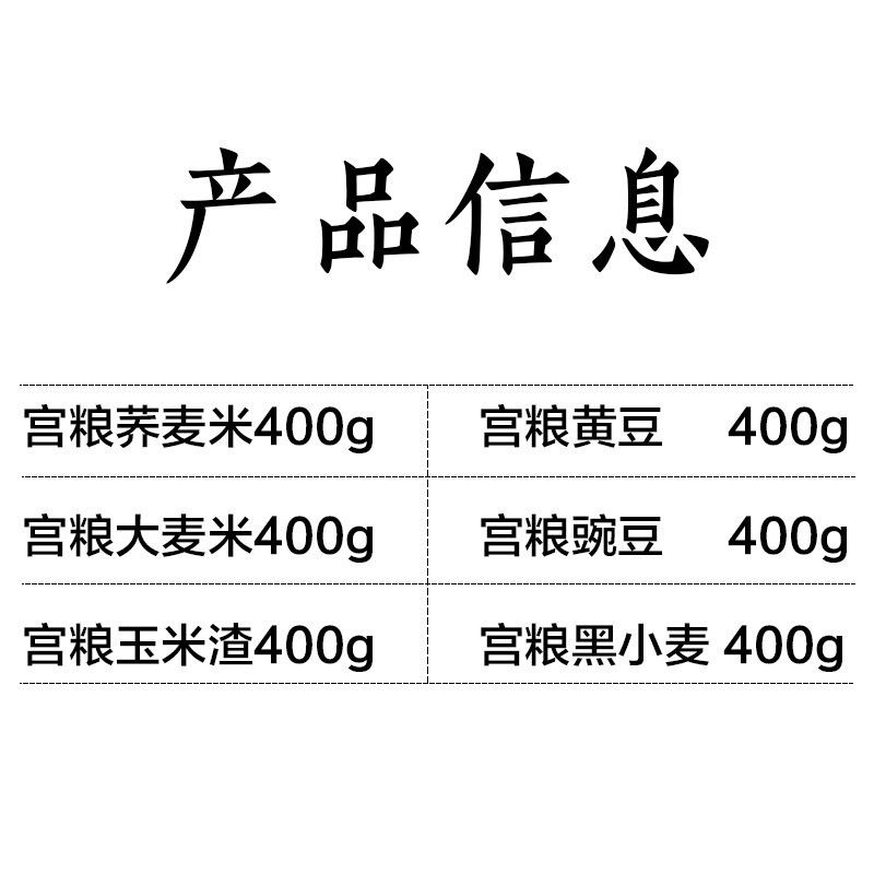 配置清单:宫粮荞麦米400g,宫粮黄豆400g 宫粮大麦米400g,宫粮豌豆400g 宫粮黑小麦400g,宫粮玉米渣400g