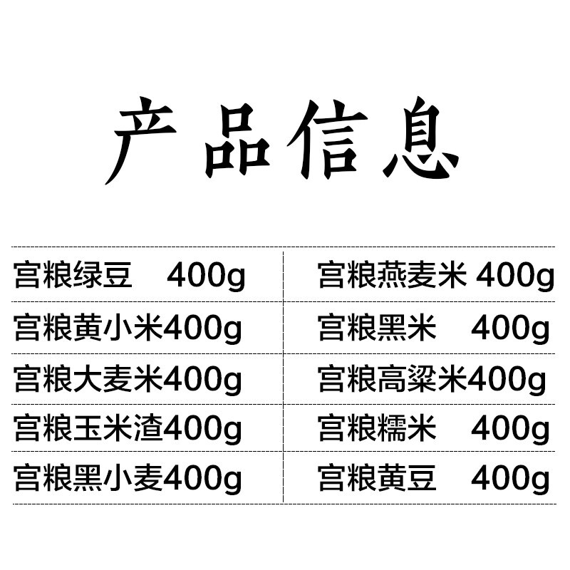 配置:宫粮绿豆400g,宫粮燕麦米400g 宫粮黄小米400g,宫粮黑米400g 宫粮大麦米400g ,宫粮高粱米400g 宫粮玉米渣400g ,宫粮糯米400g 宫粮黑小麦400g ,宫粮黄豆400g