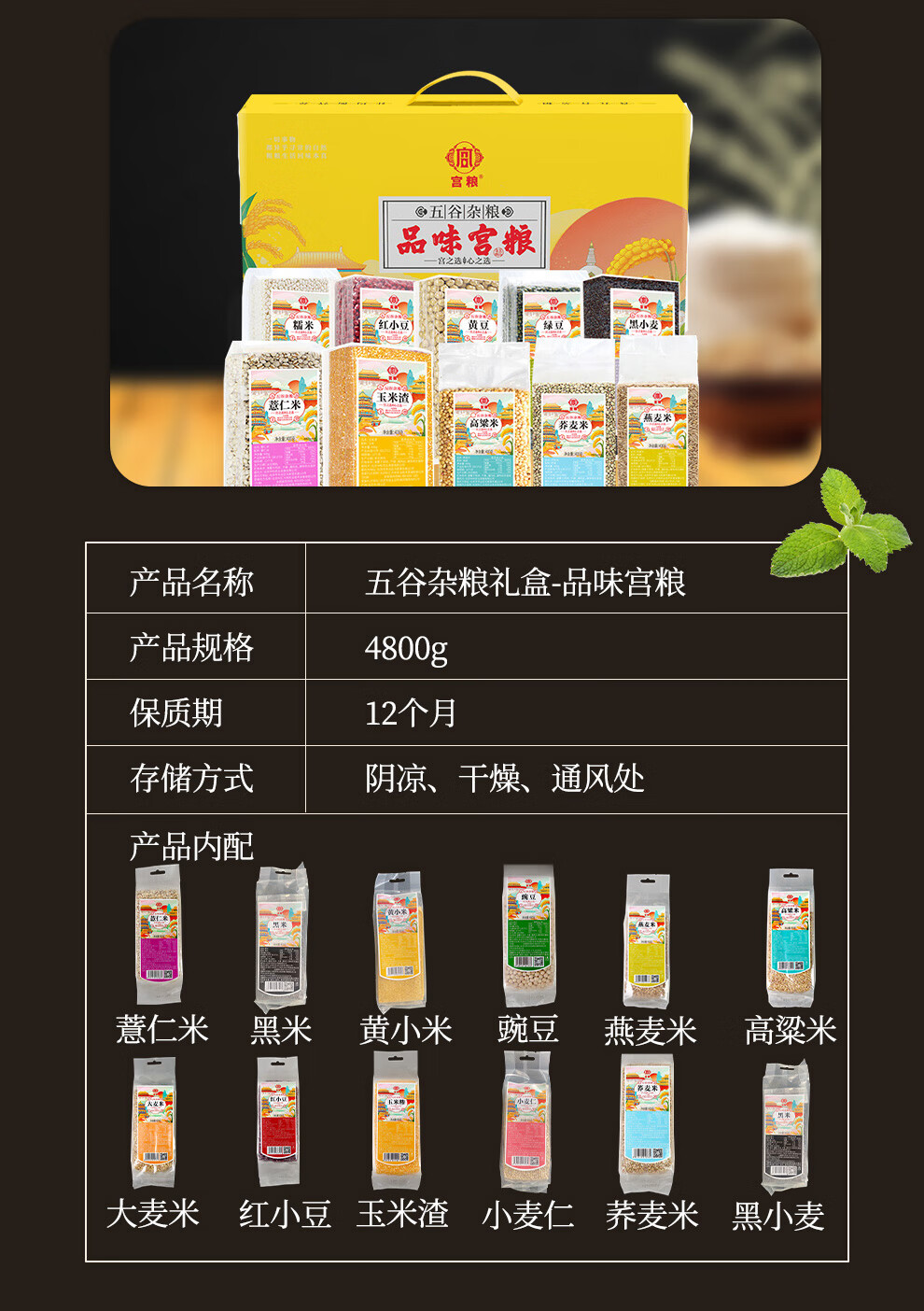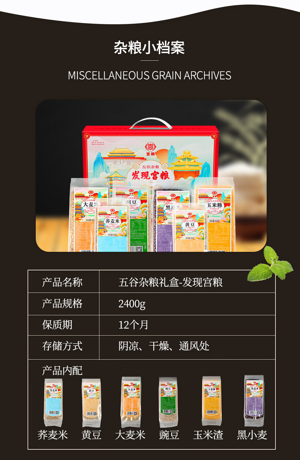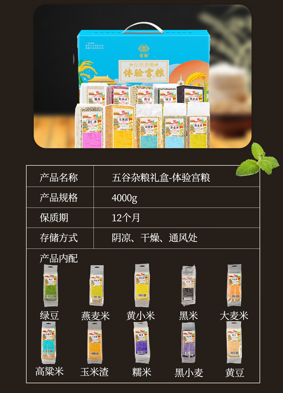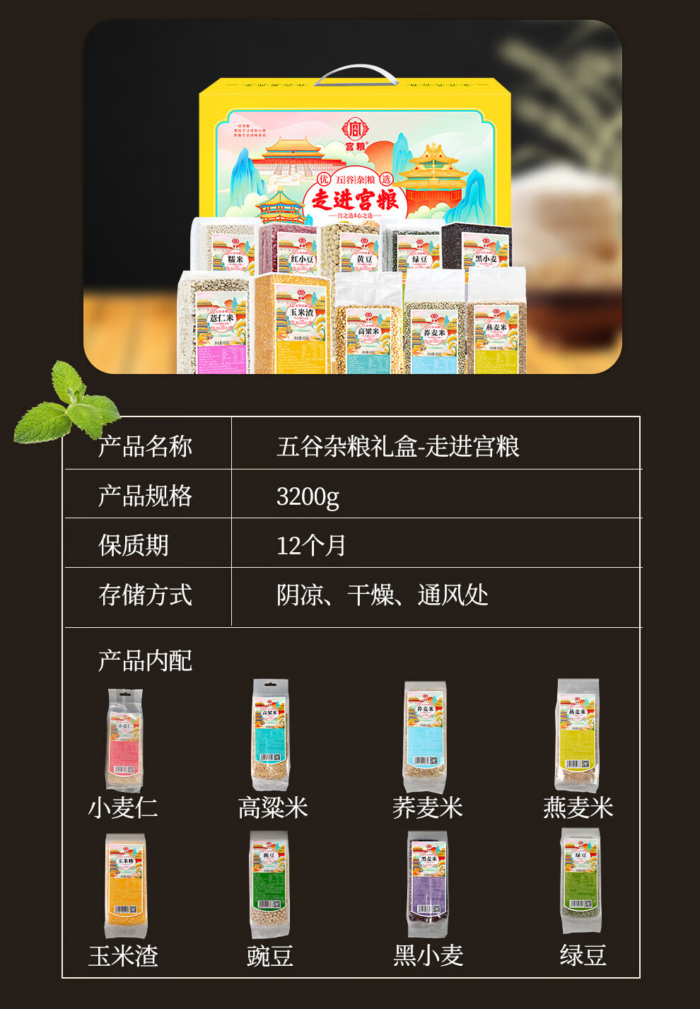 配置清单:宫粮绿豆400g,宫粮燕麦米400g 宫粮黄小米400g,宫粮黑米400g 宫粮大麦米400g ,宫粮高粱米400g 宫粮玉米渣400g ,宫粮糯米400g 宫粮黑小麦400g ,宫粮黄豆400g