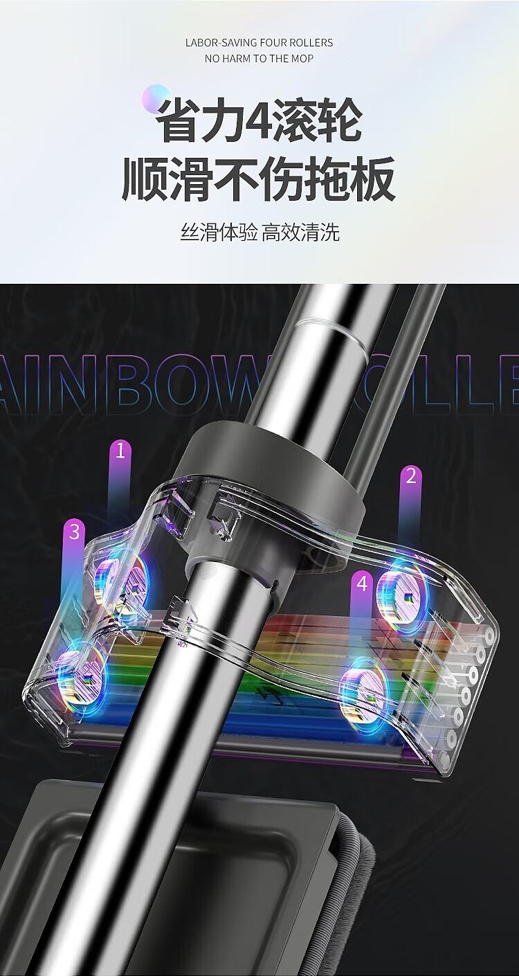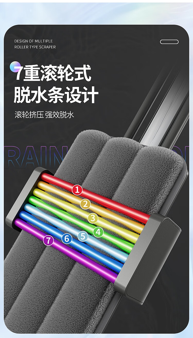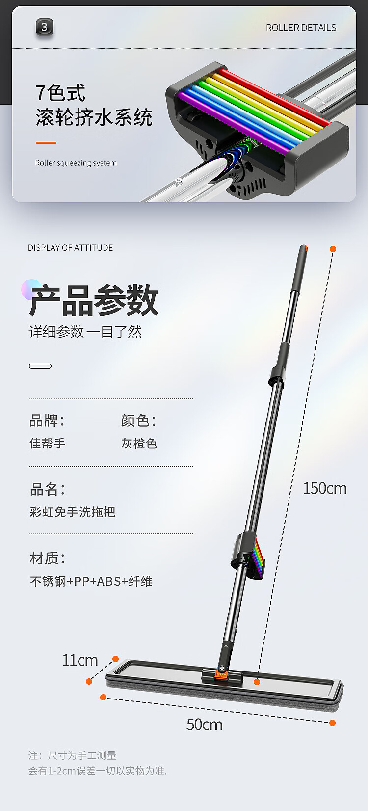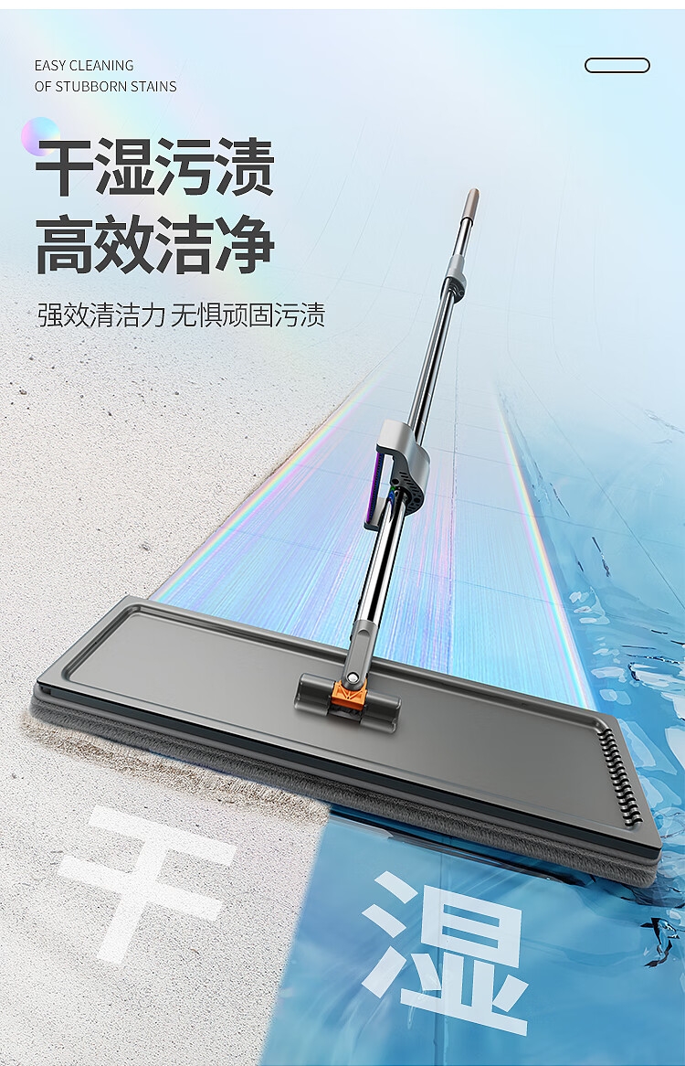 50cm大板头,清洁高效拖地快;7重滚轮式脱水条设计;干湿污渍,高效洁净