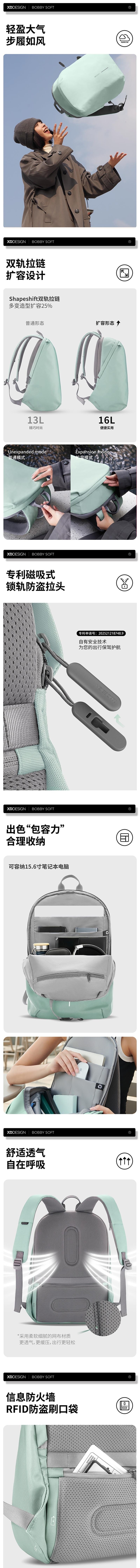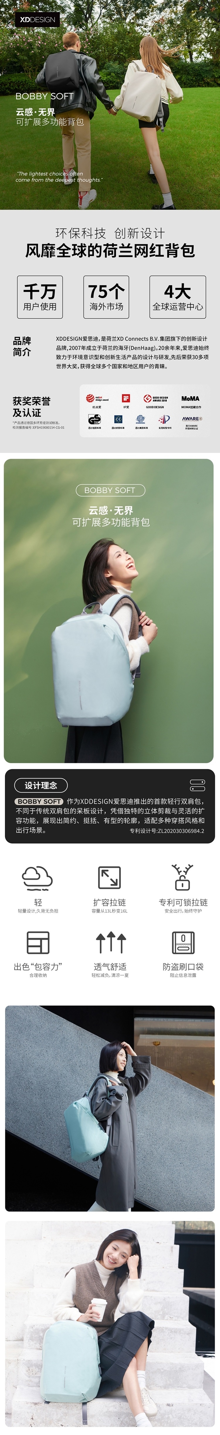 采用Aware®区块链技术验证的RPET面料制作;轻便灵活,收纳功能强大;双轨拉链可扩容25%