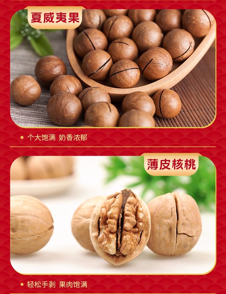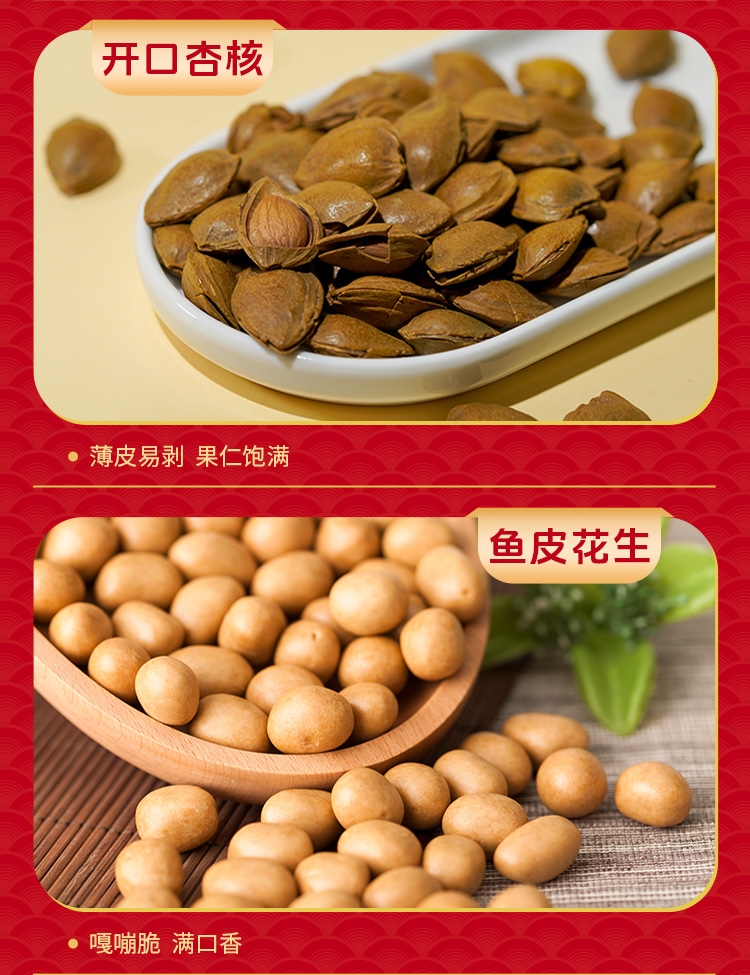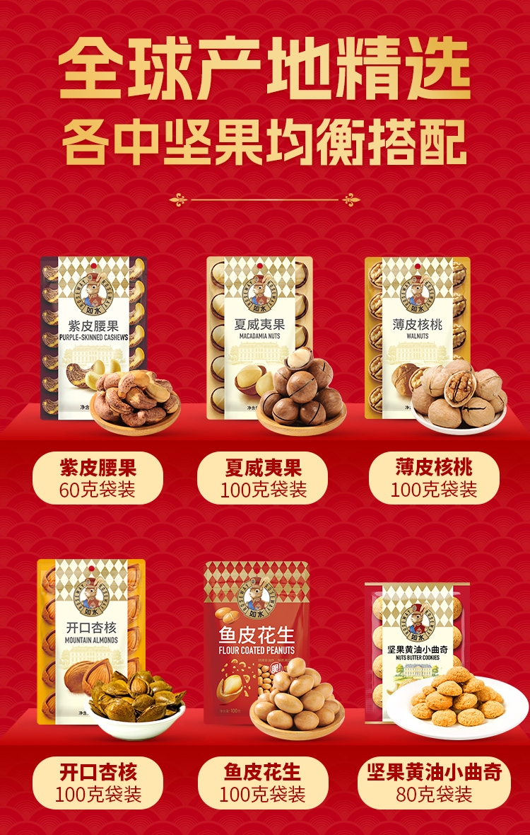 如水坚果全球原产地直采,只挑选高等级高品质原材料;7大袋+2小袋,9种美味一次 享受;發”字为魂,海涛纹为韵,融 入东方传统色彩