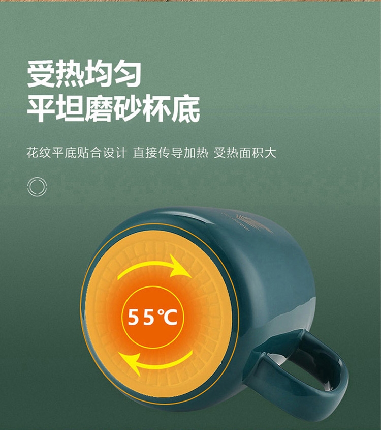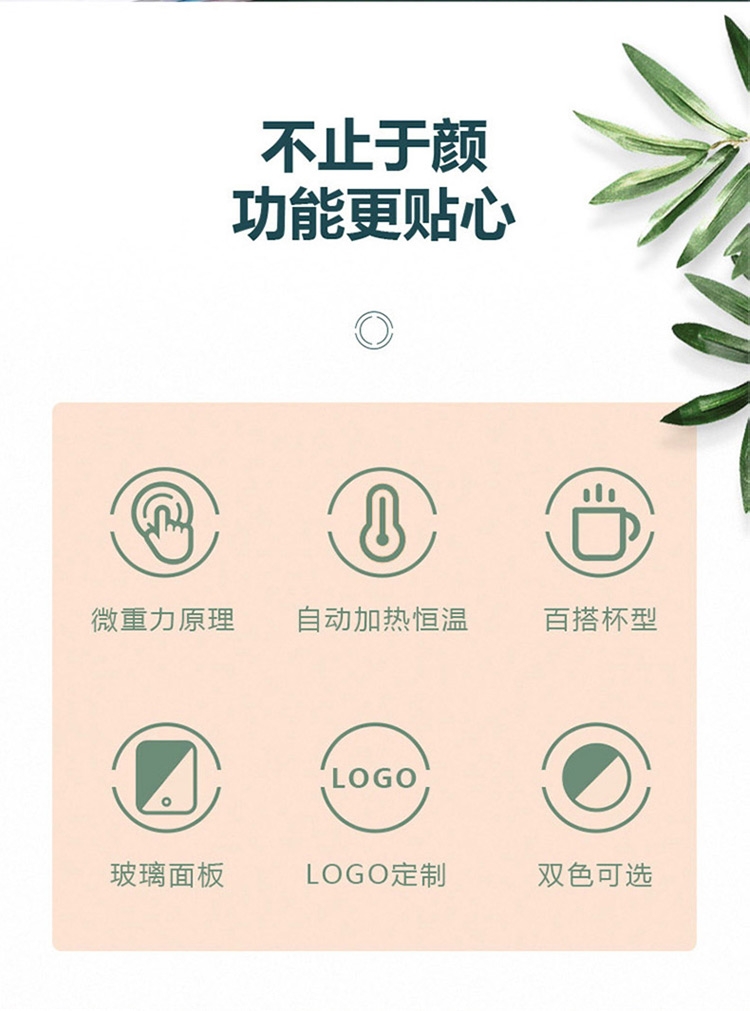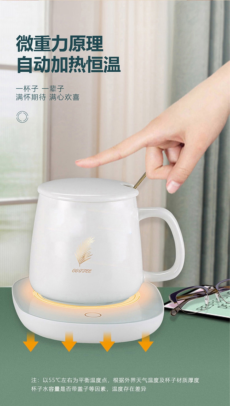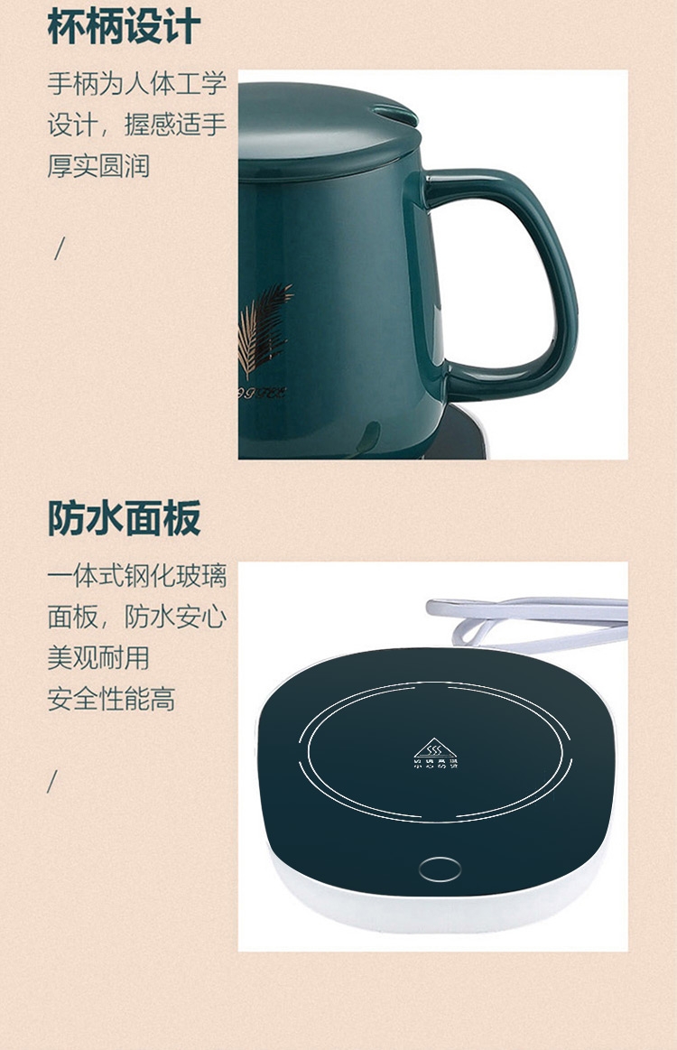 微重力设计,百搭杯型,不挑杯;55℃自动加热恒温,55℃温暖一整天;防水安心钢化玻璃面板;花纹平底贴合设计,直接传导加热,受热面积大;杯底分离,安全保护设计