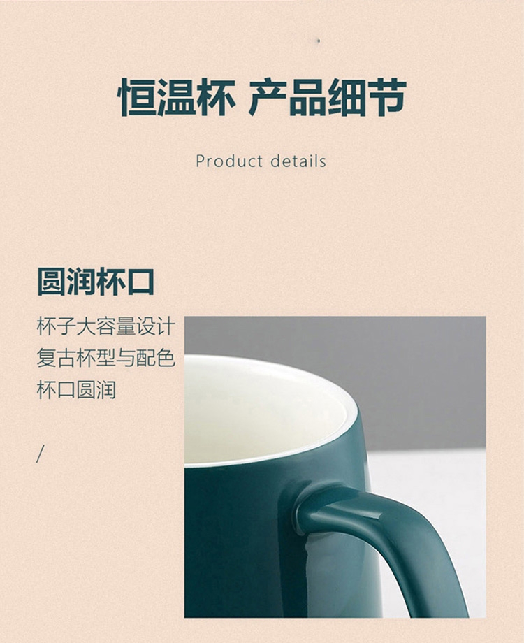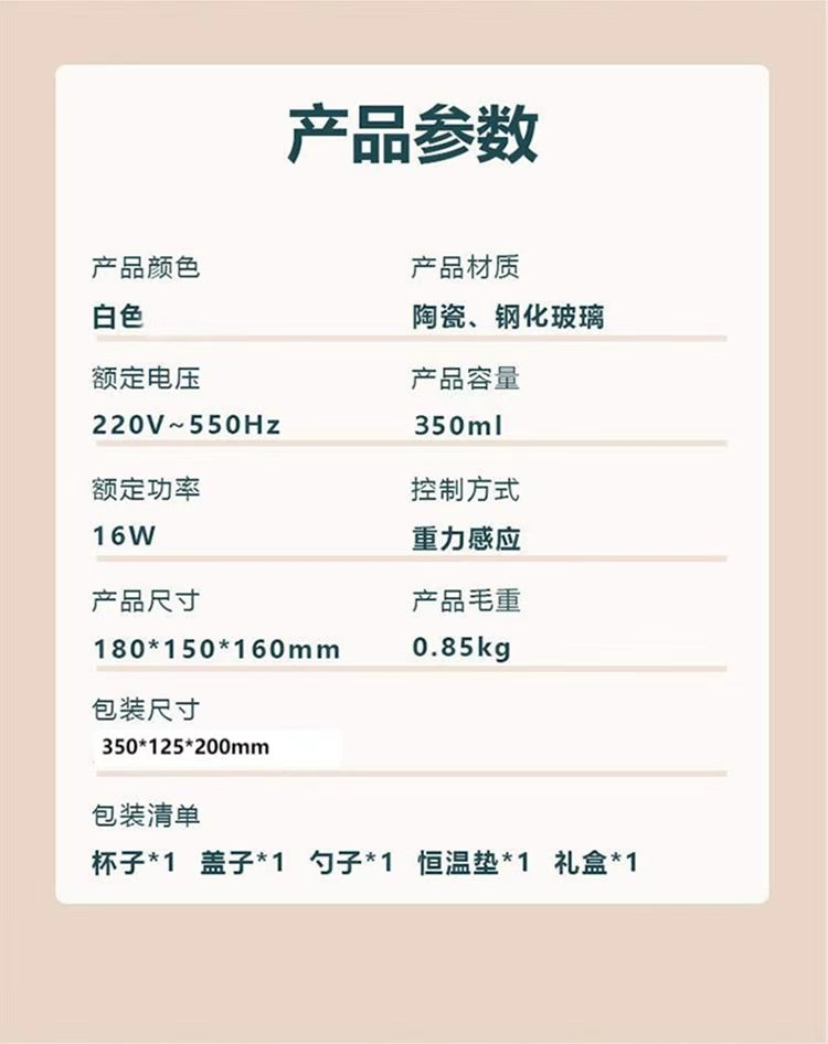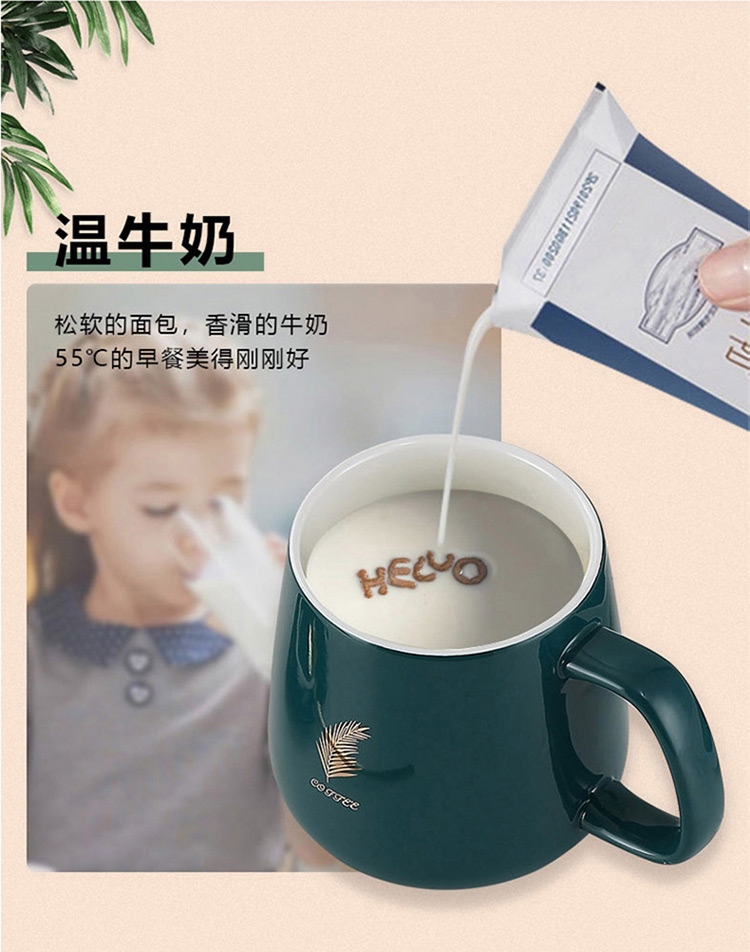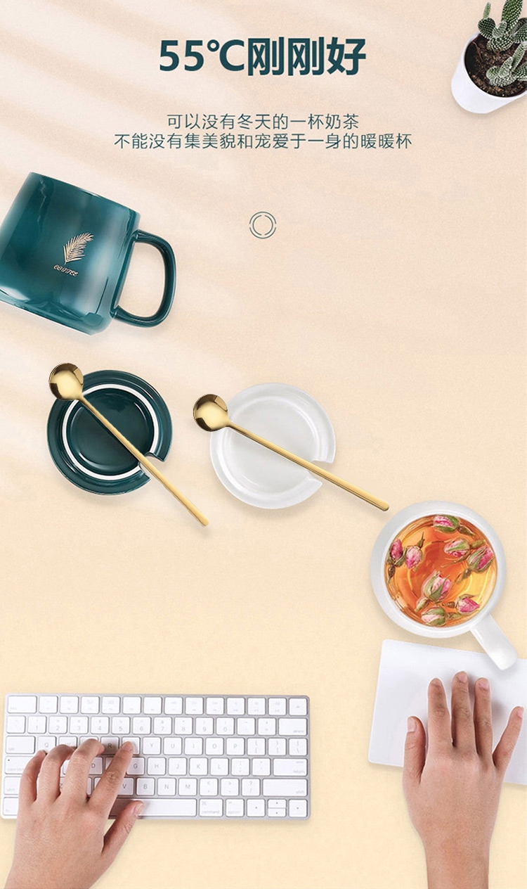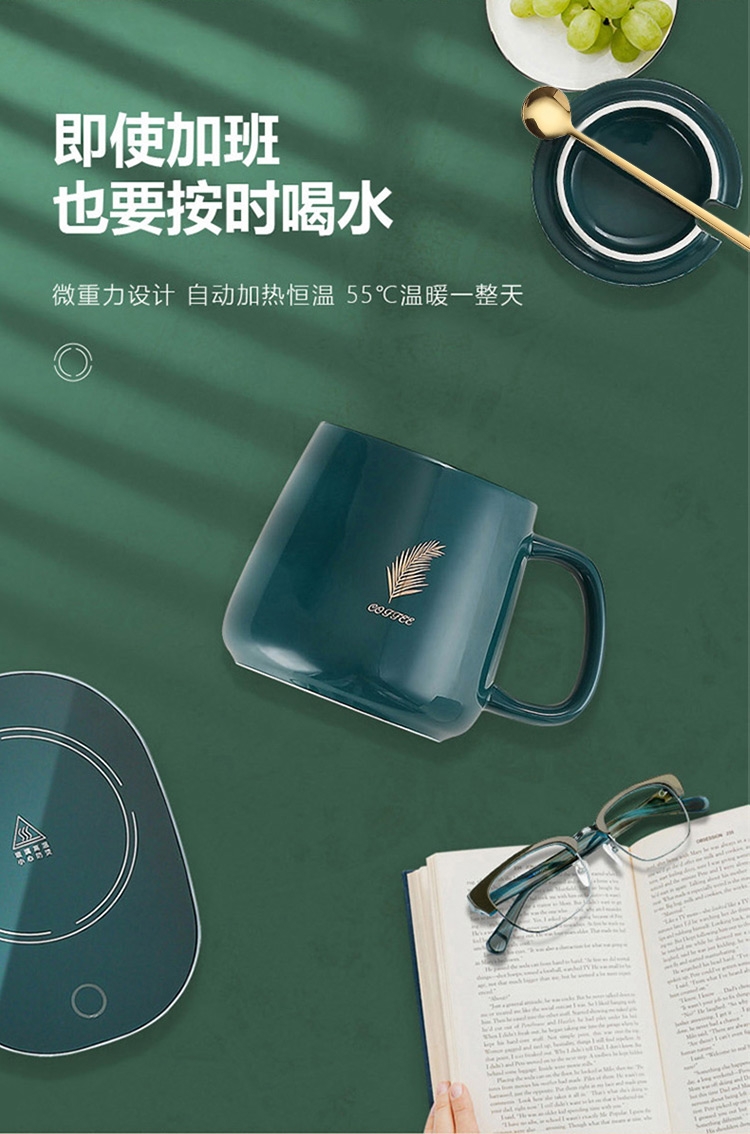 微重力设计,百搭杯型,不挑杯;55℃自动加热恒温,55℃温暖一整天;防水安心钢化玻璃面板;花纹平底贴合设计,直接传导加热,受热面积大;杯底分离,安全保护设计