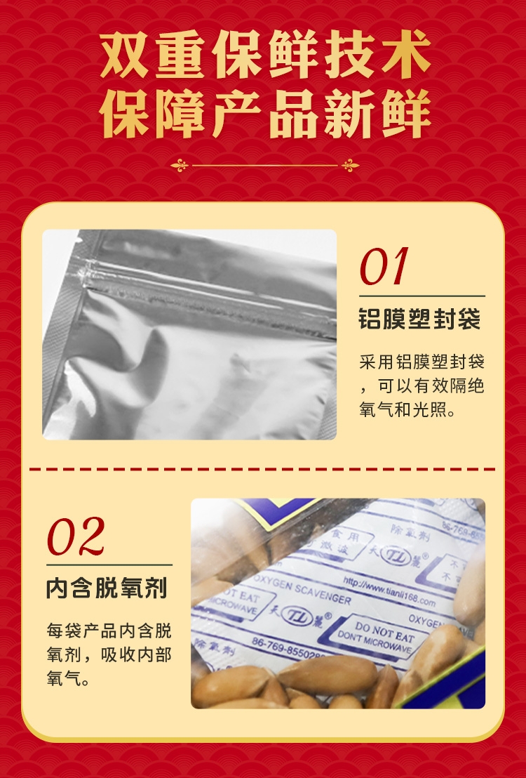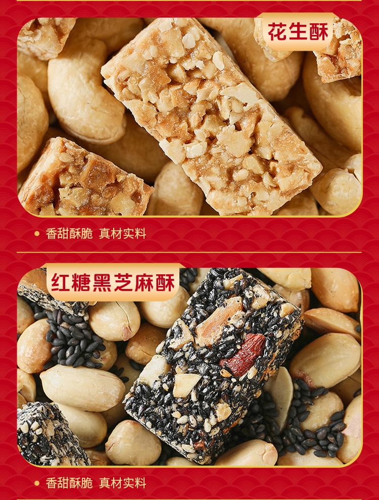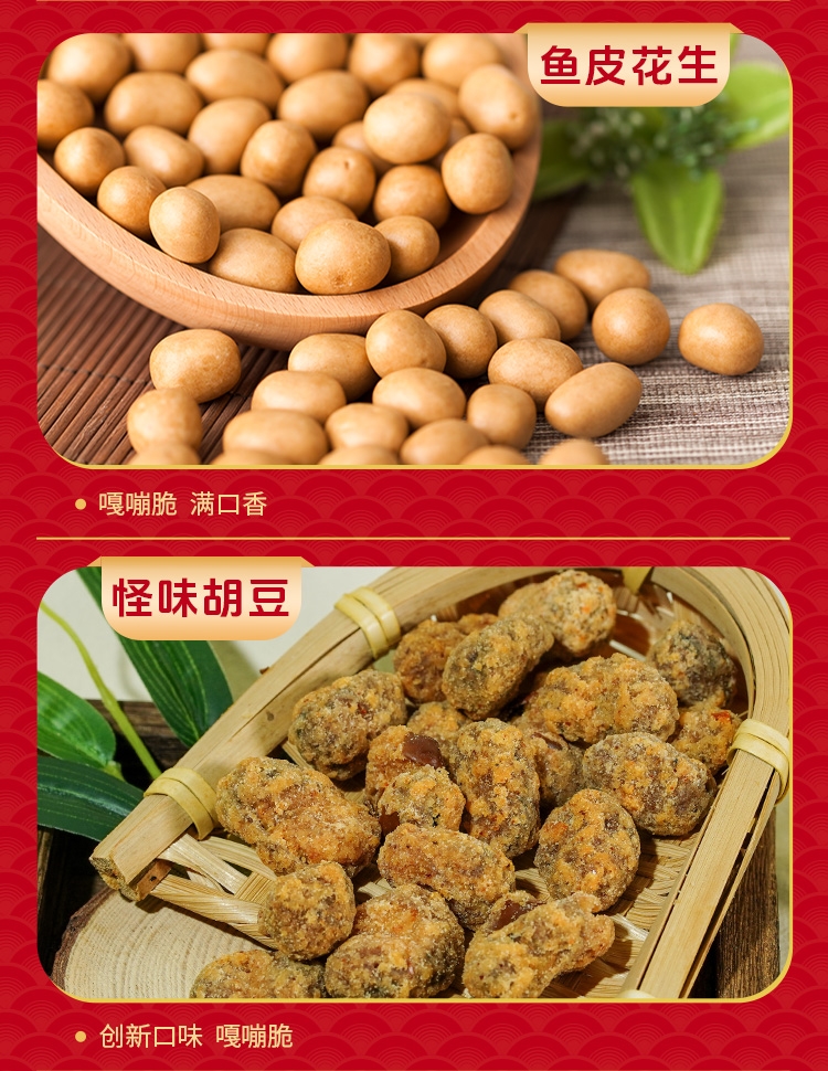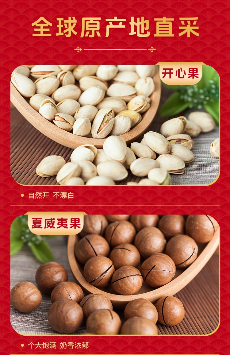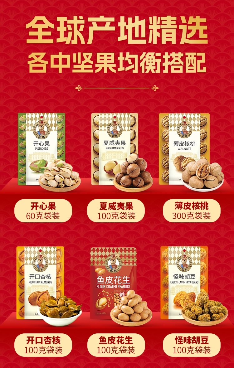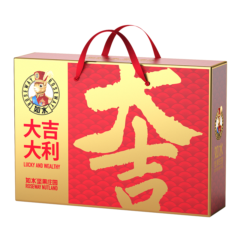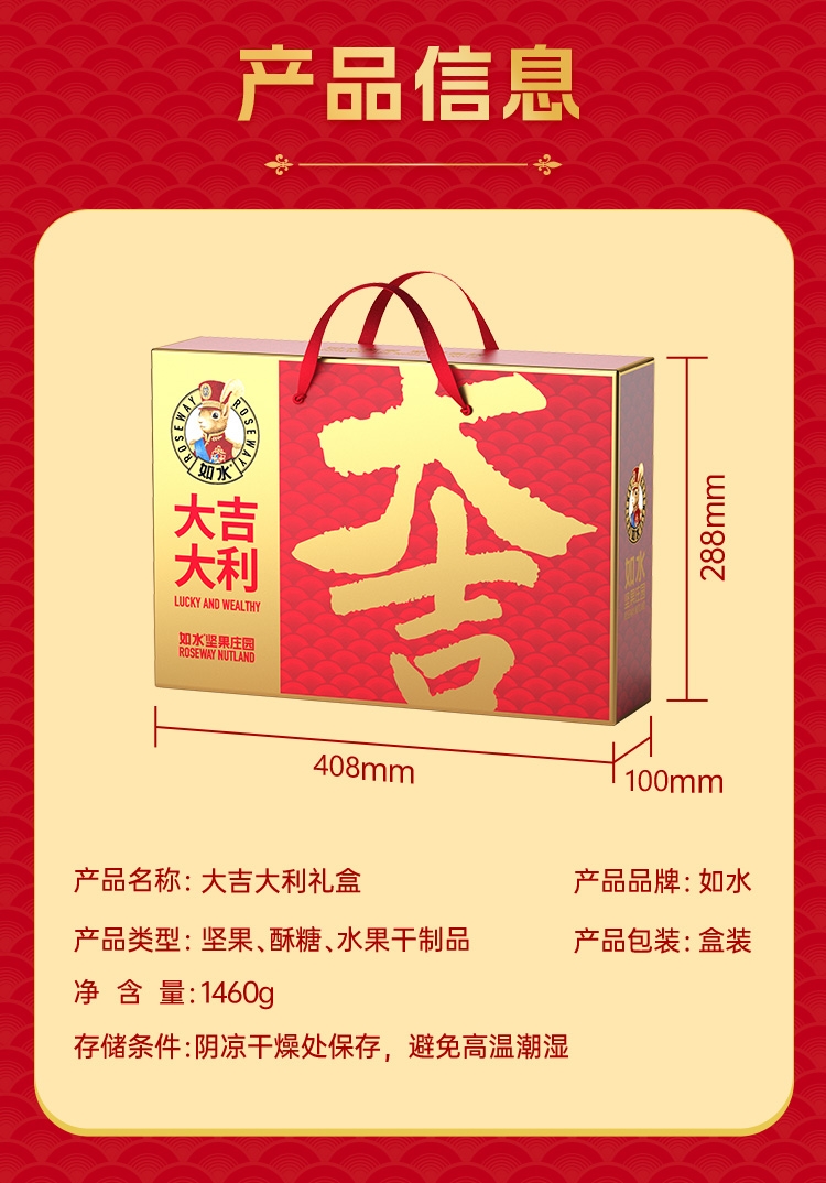如水坚果全球原产地直采,只挑 选高等级高品质原材料;6种坚果炒货+2种蜜饯 果干+2种坚果酥糖;“大吉”字为魂,海涛纹为 韵,融入东方传统色彩