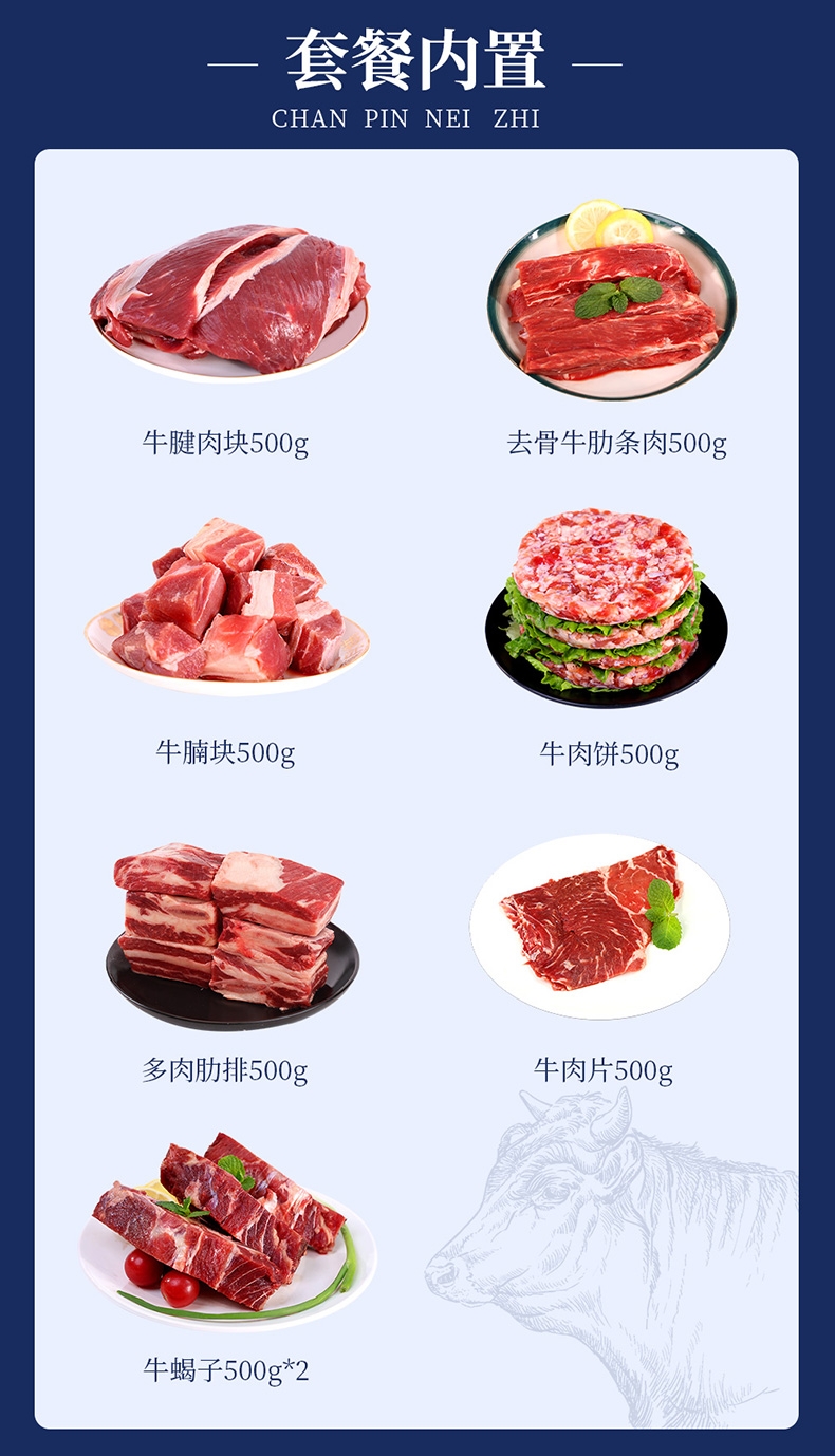 配置清单:澳洲谷饲安格斯牛腱肉块500g 澳洲谷饲安格斯去骨牛肋条肉500g 澳洲谷饲安格斯牛腩肉块500g 澳洲谷饲安格斯牛肉饼500g 澳洲谷饲安格斯牛肉片500g 澳洲谷饲安格斯多肉肋排500g 澳洲谷饲安格斯牛蝎子500g*2