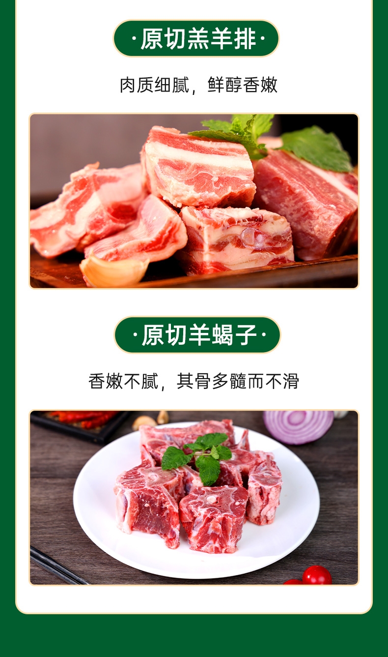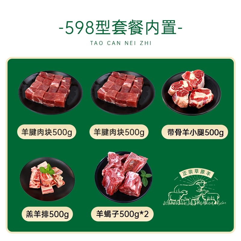 配置清单:内蒙草原原切羊腱肉块500g 内蒙草原原切羊腱肉快500g 内蒙草原原切带骨羊小腿500g 内蒙草原原切羔羊排500g 内蒙草原原切羊蝎子500g*2