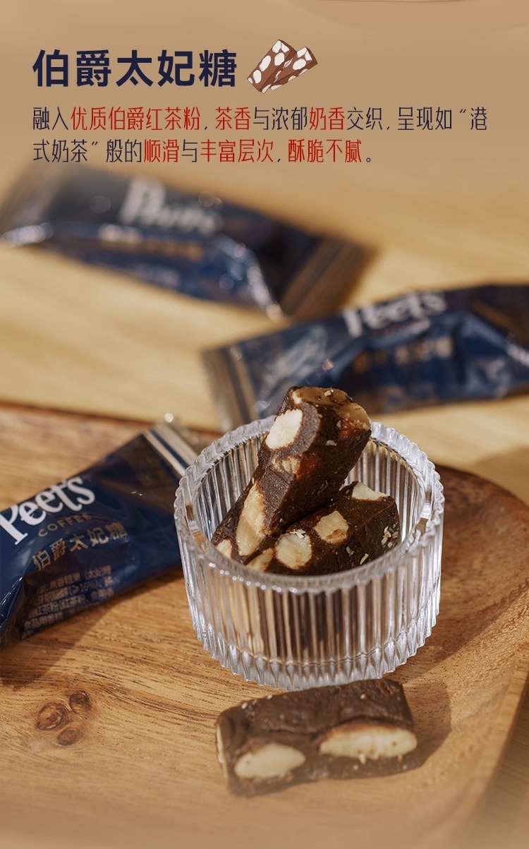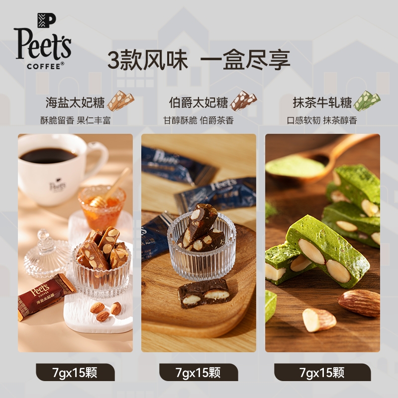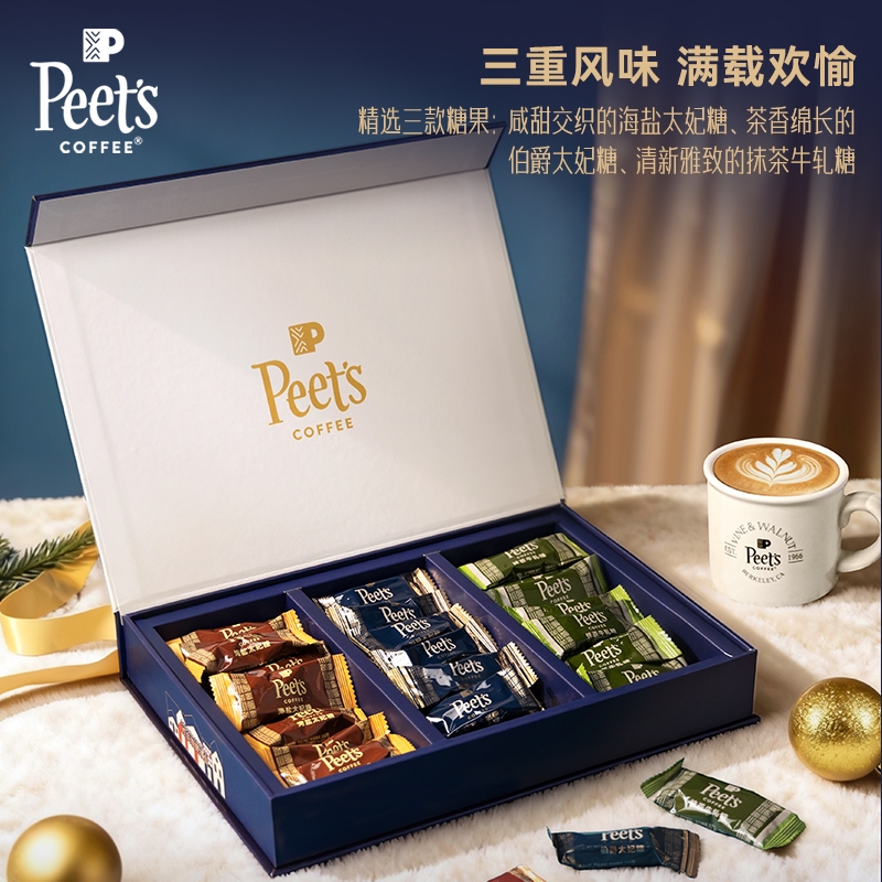 配置清单:Peets Coffee 海盐太妃糖105g(7克*15粒) Peets Coffee 伯爵太妃糖105g(7克*15粒) Peets Coffee 抹茶风味牛轧糖105g(7克*15粒) Peets Coffee 定制礼盒*1