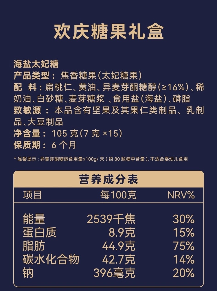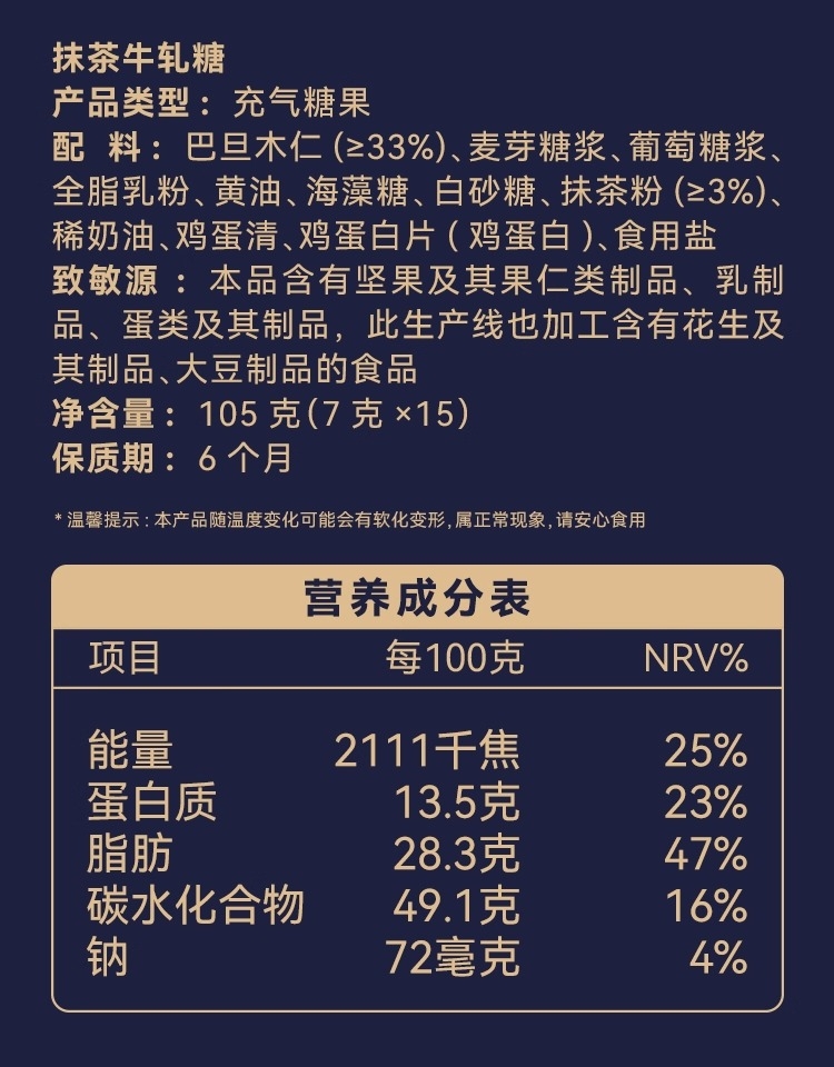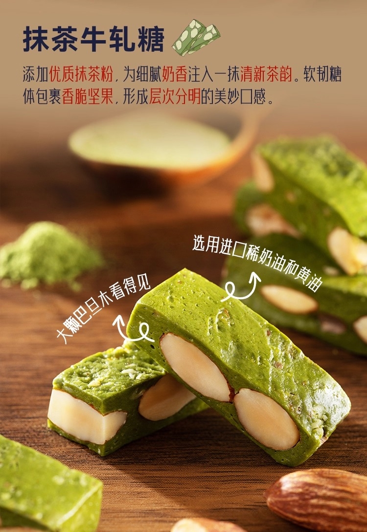 海盐太妃糖:酥脆留香,果仁丰富;伯爵太妃糖:甘醇酥脆,伯爵茶香;抹茶牛轧糖:口感软韧,抹茶醇香