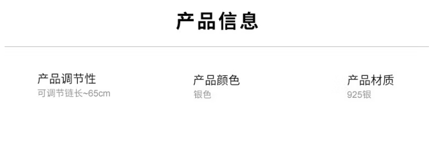 产品可调节性:可调节链长~65cm;产品材质:925银;产品颜色:银色