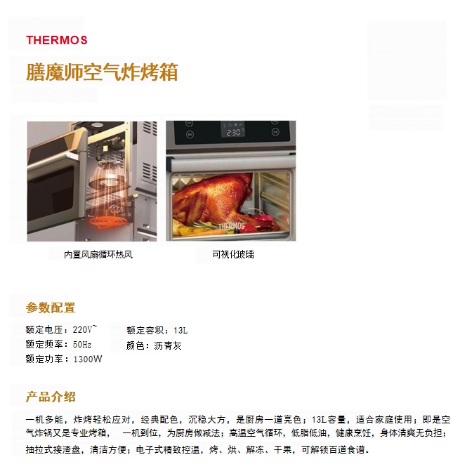 一机多能,炸烤轻松应对,经典配色,沉稳大方;额定电压:220V~额定频率:50Hz;额定功率:1300W
