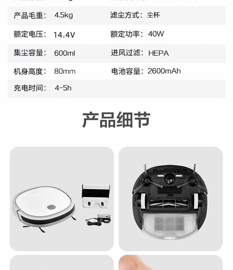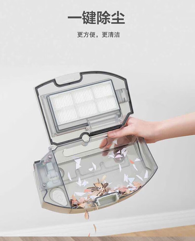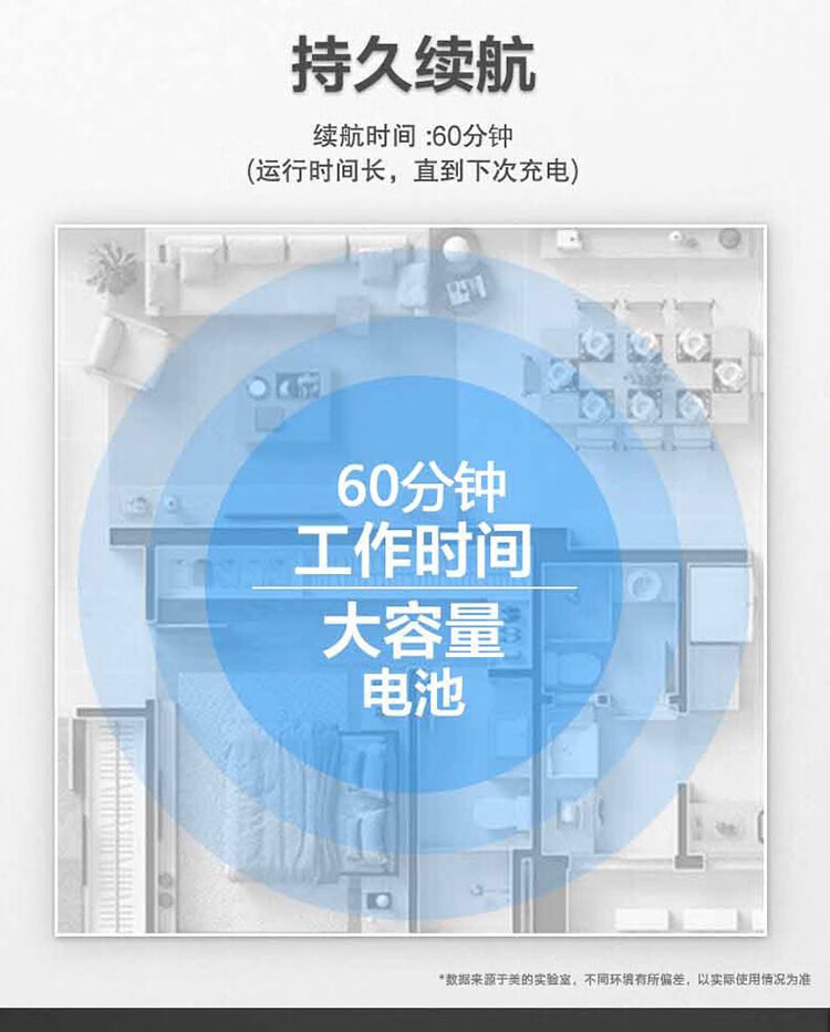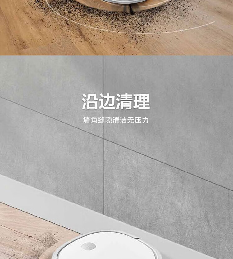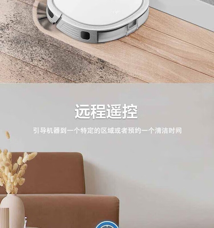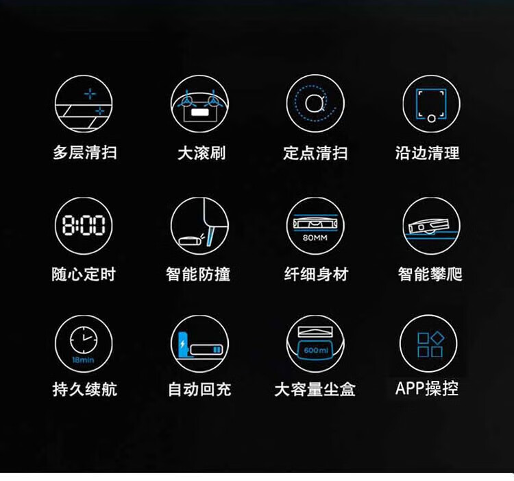 多层清扫,大滚刷;;定点清扫,沿边清理;;随心定时,智能防撞;;纤细身材,智能攀爬;;大容量尘盒和水箱,APP操控;