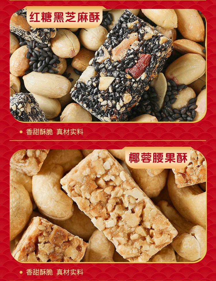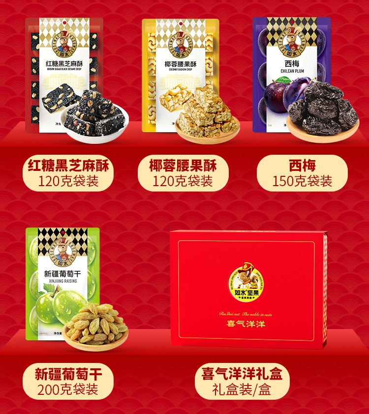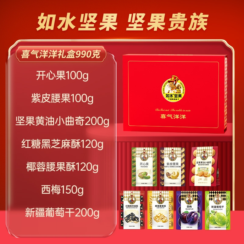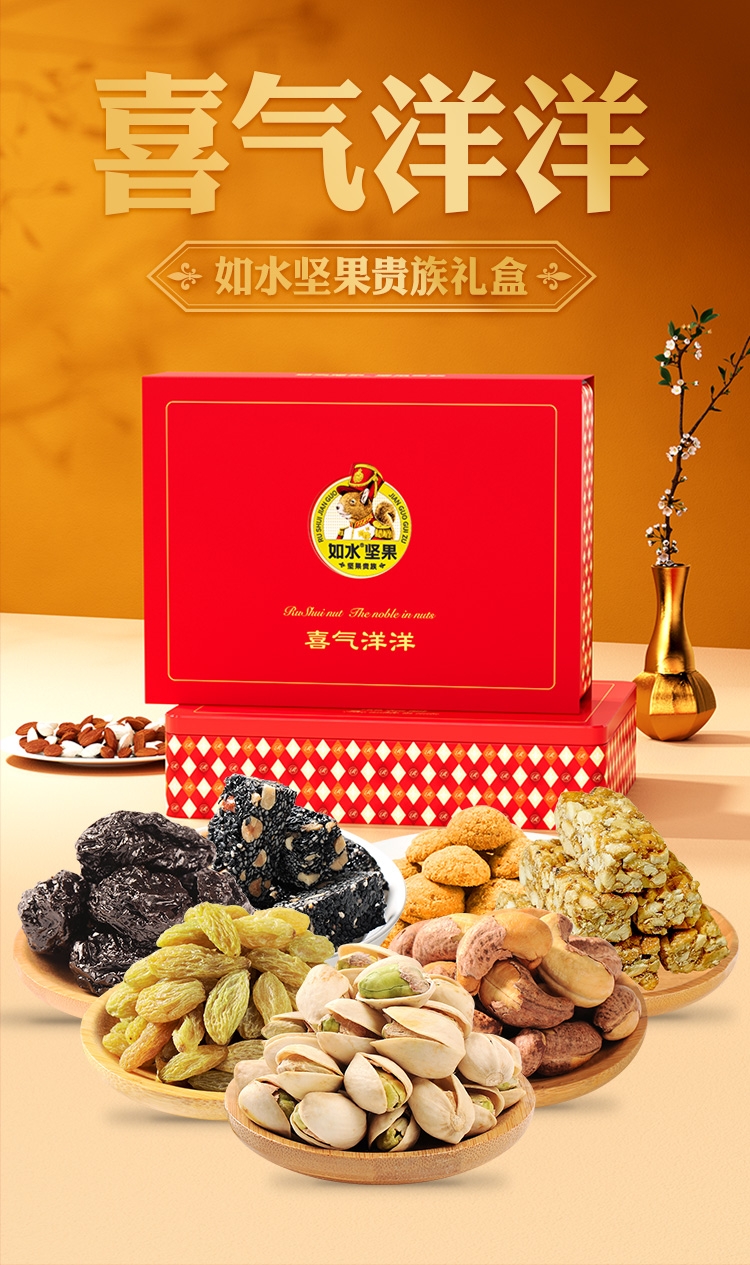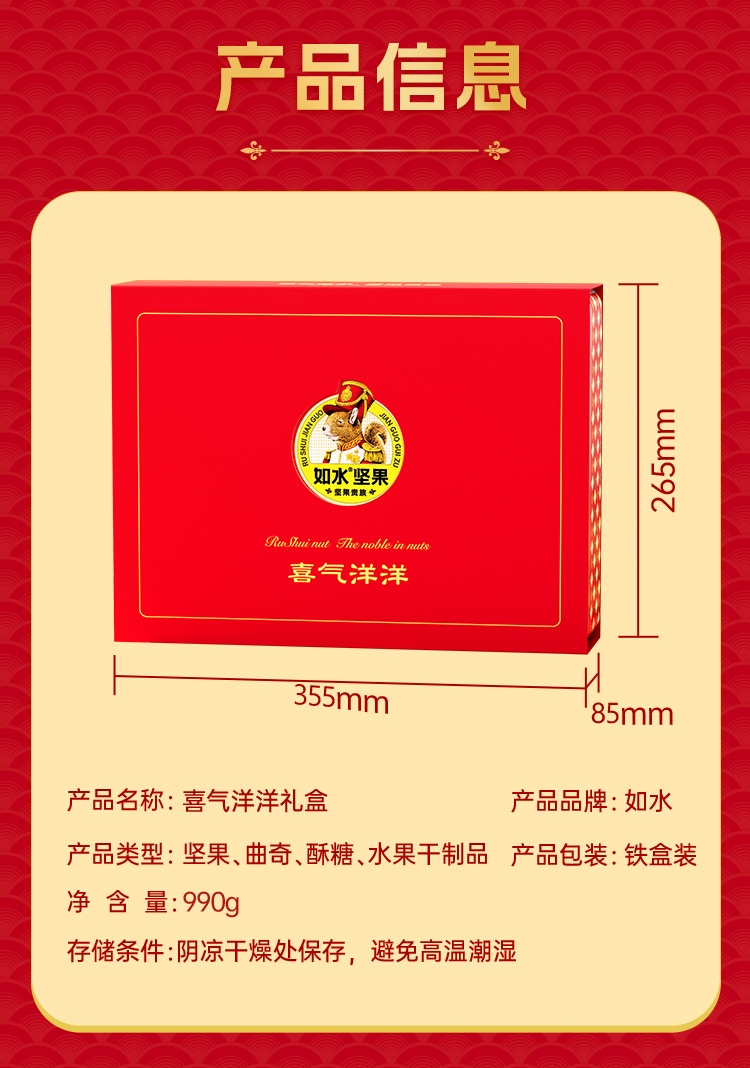 如水坚果全球原产地直采,只挑选高等级高品质原材料;2种坚果炒货+2种蜜饯果干+2种坚果酥糖+1种曲奇;经典红色铁礼盒,上面印制激 凸质感的如水松鼠圆标