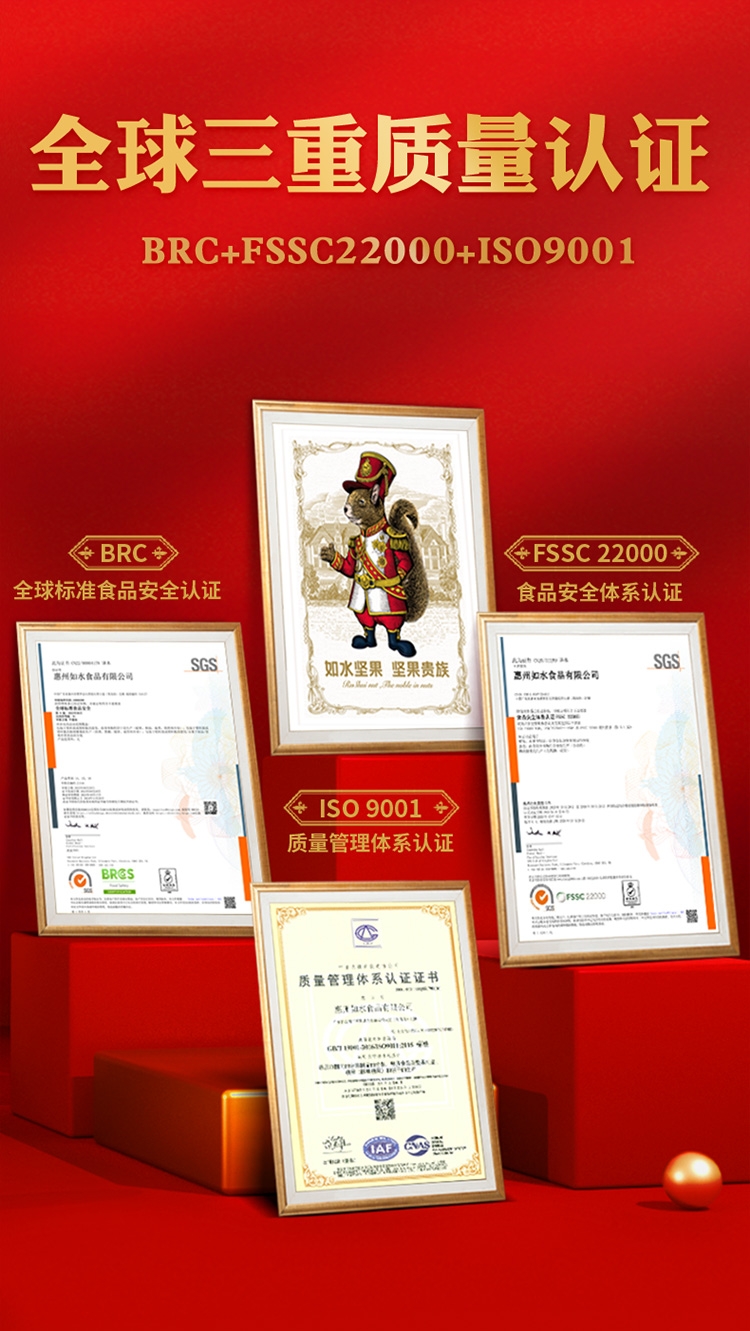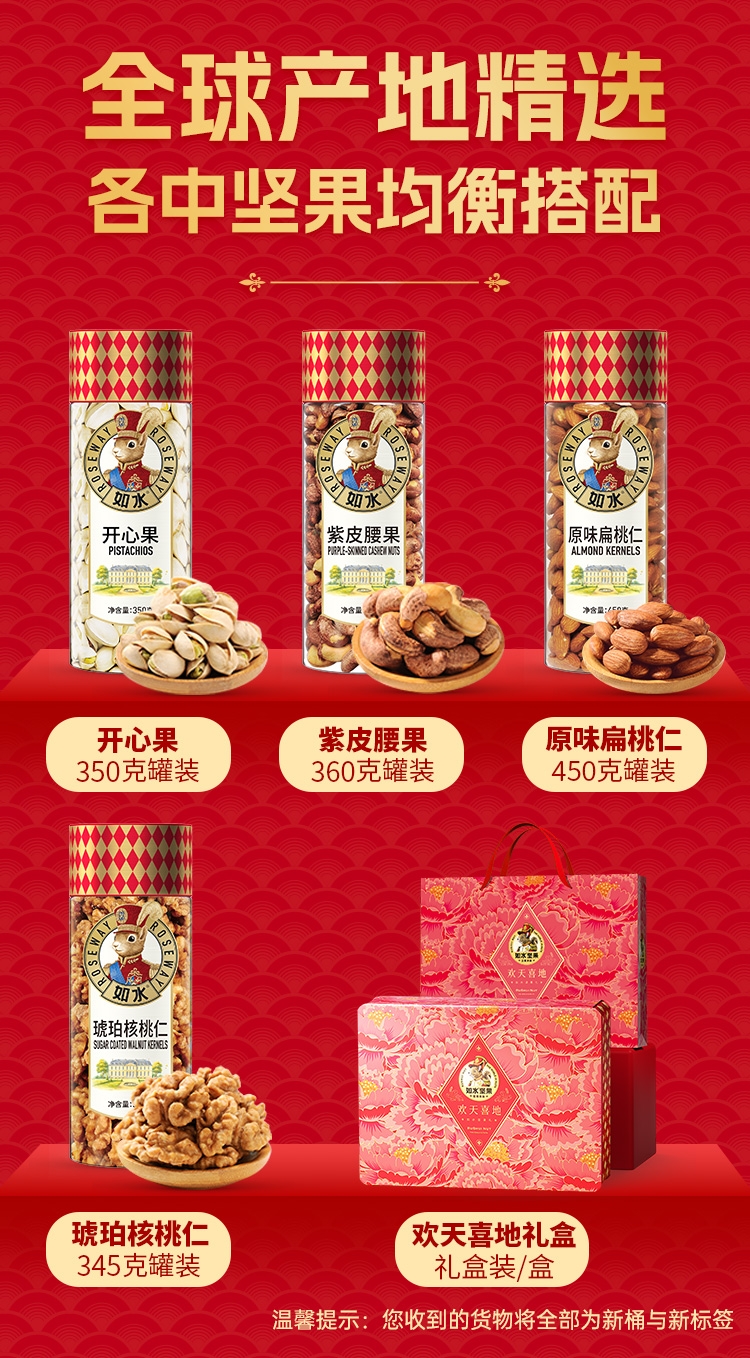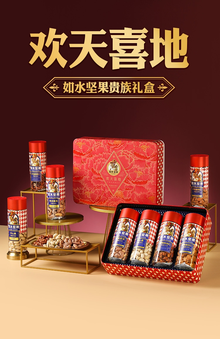 如水坚果全球原产地直采,只挑选高等级高品质原材料;4种坚果炒货一次享受。 精致罐装,高档大气;节日送礼送领导送长辈,春节端午中秋员工礼品福利