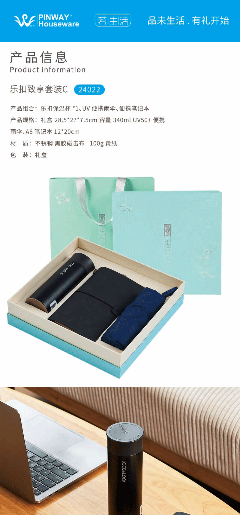 产品组合:乐扣保温杯*1、UV便携雨伞*1、便携笔记本*1