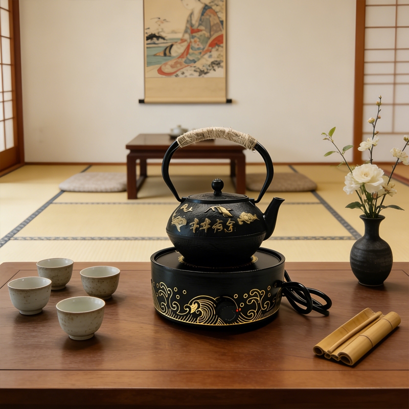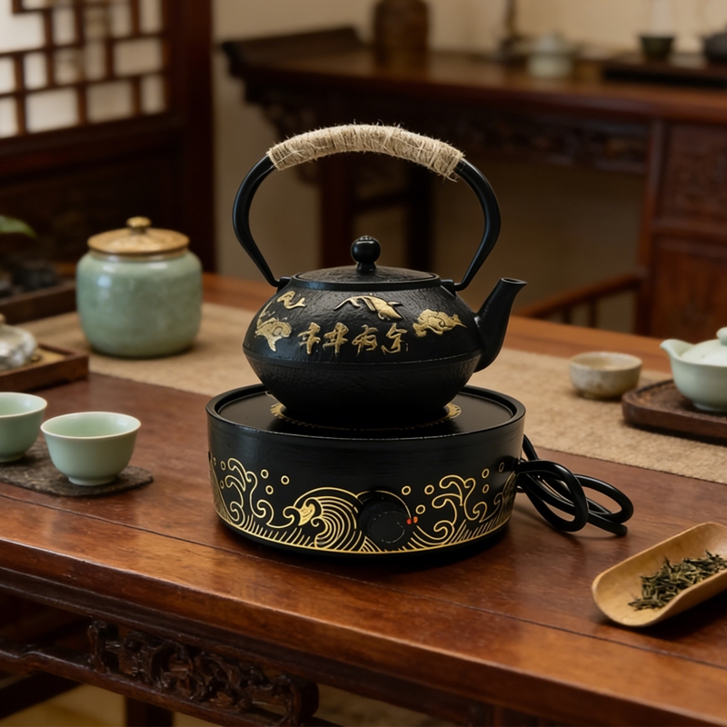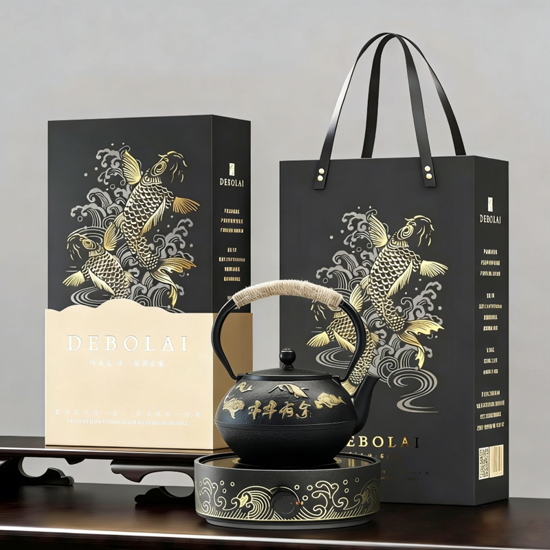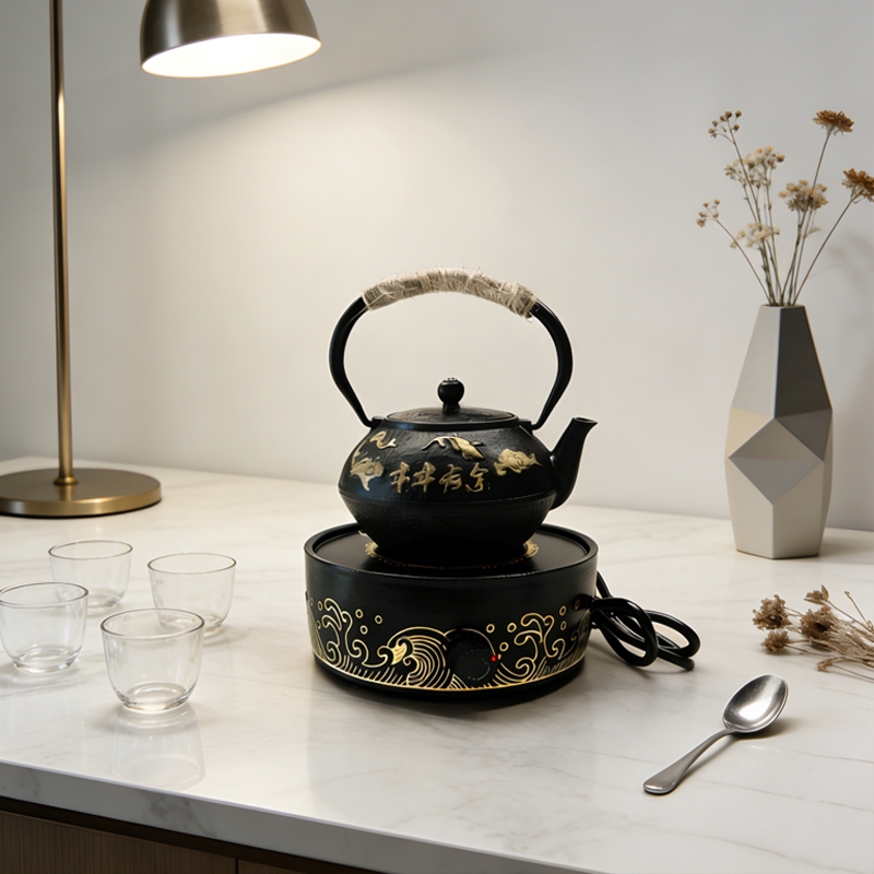 日本铁壶技术,年年有鱼鎏金图案,寓意吉祥。;改善水质:铁壶烧水释放微量铁离子,吸附氯离子,使水;导热均匀:全方位受热,沸点高,确保煮茶最佳温度。