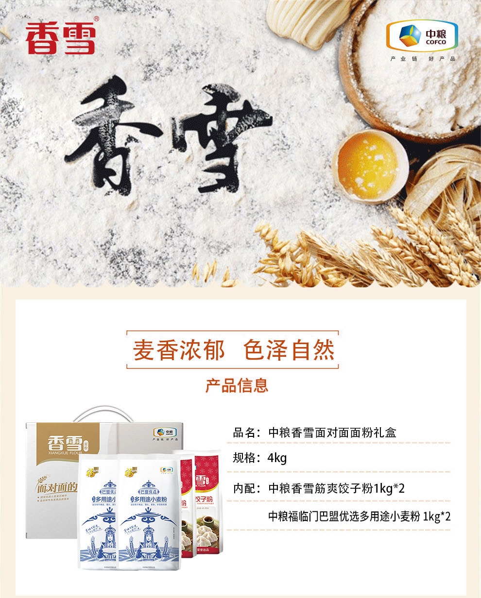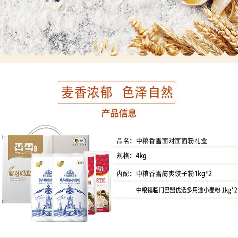 配置清单:净含量:4kg 内配: 中粮香雪筋爽饺子粉 1kg*2 中粮福临门巴盟优选多用途小麦粉 1kg*2