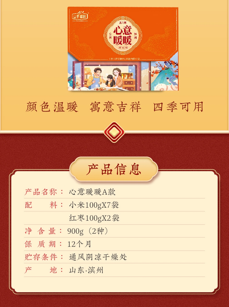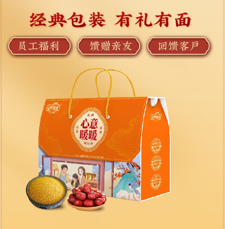 合理搭配,暖心暖胃;颗粒饱满,米油深厚,色泽金黄;礼盒包装温馨画面,送礼有面子