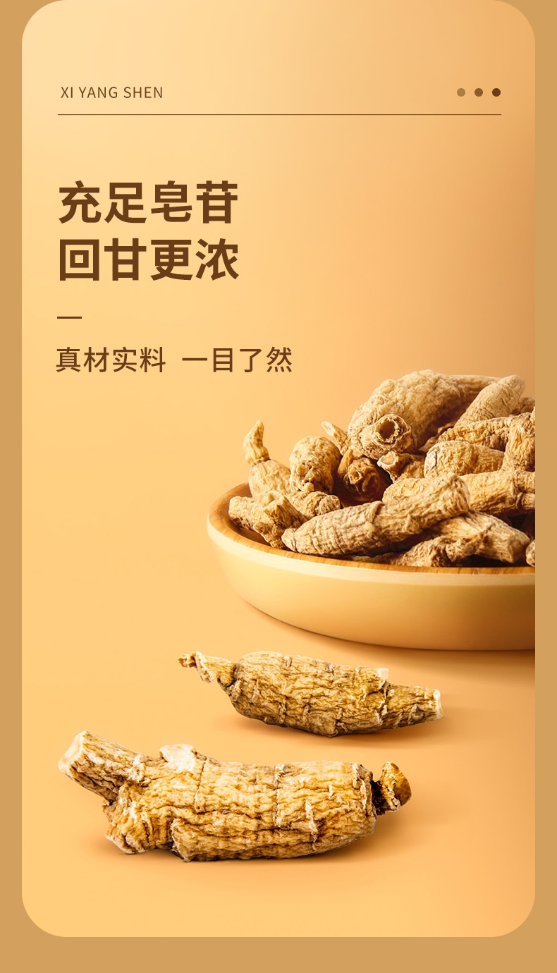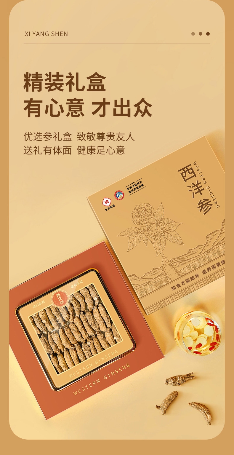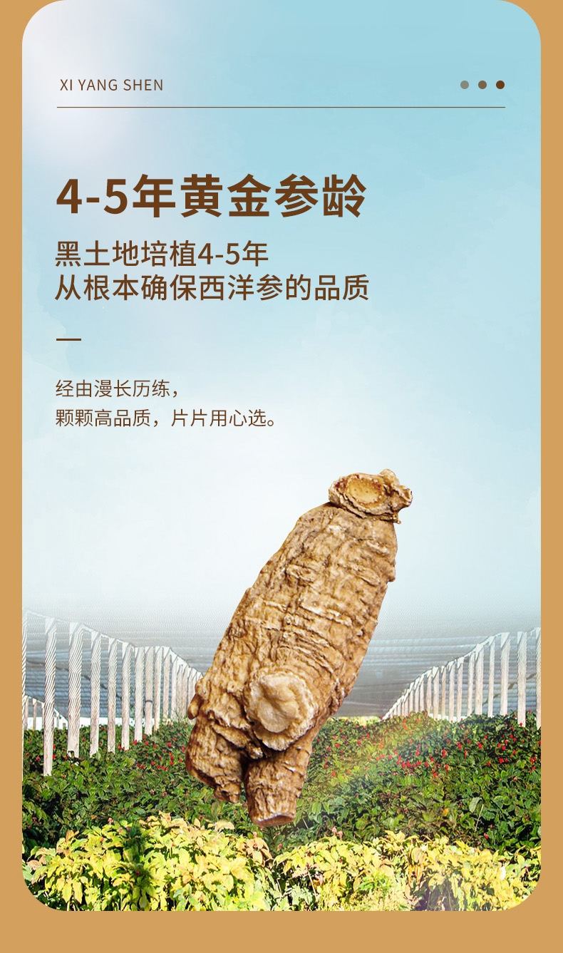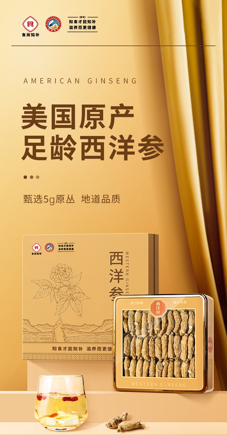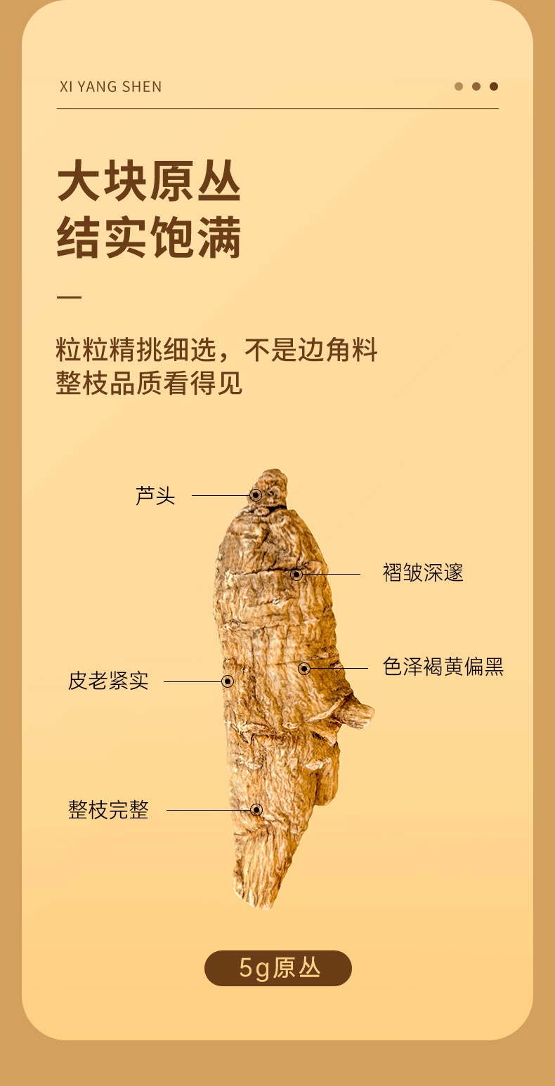 源自美国进口西洋参;皂苷含量高,参味浓郁,皮色偏深质地结实,肉质饱满,;手工甄选,无残人参,无农药残留