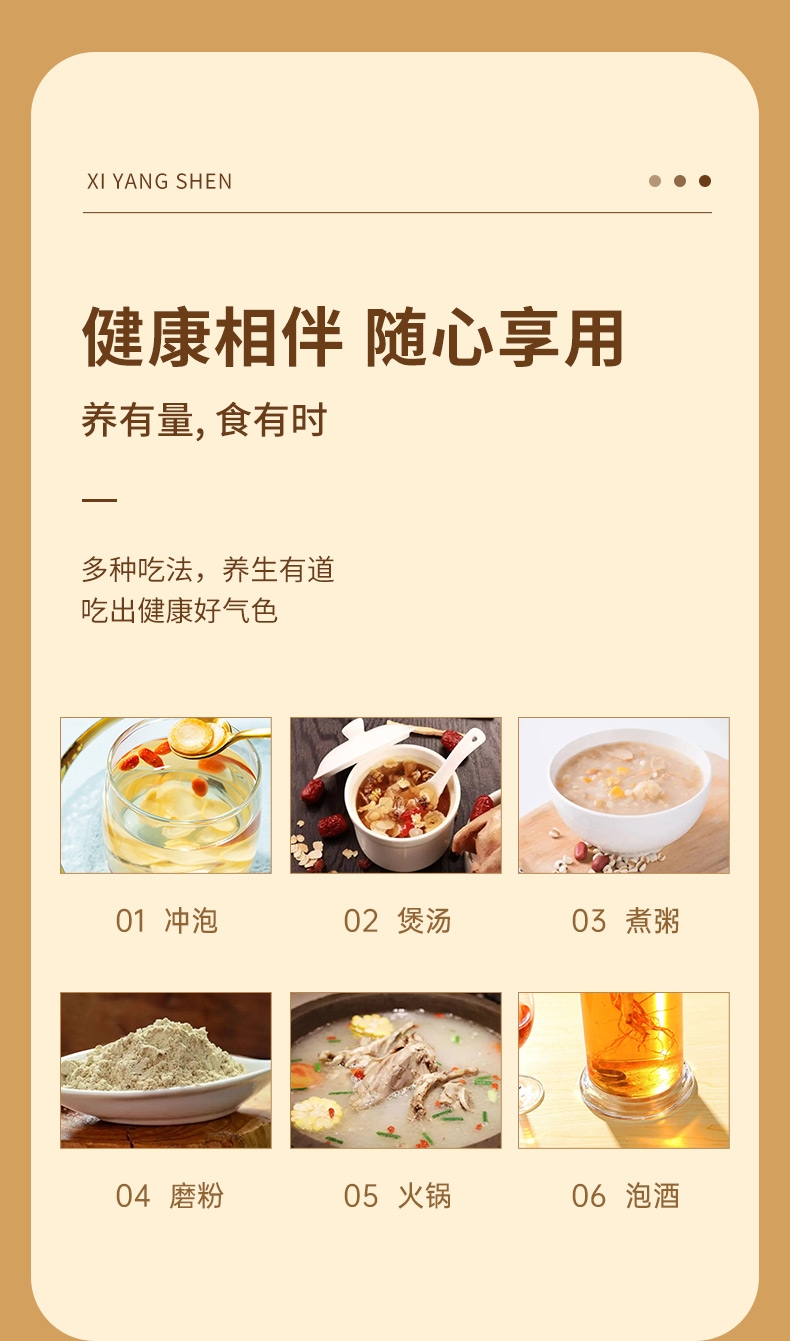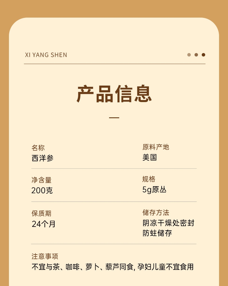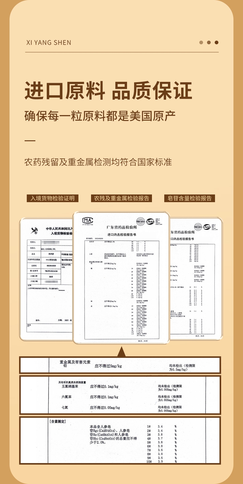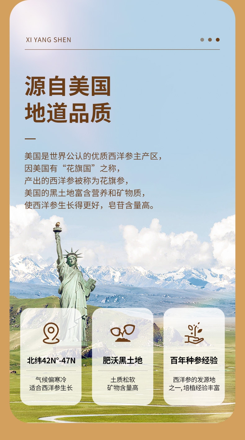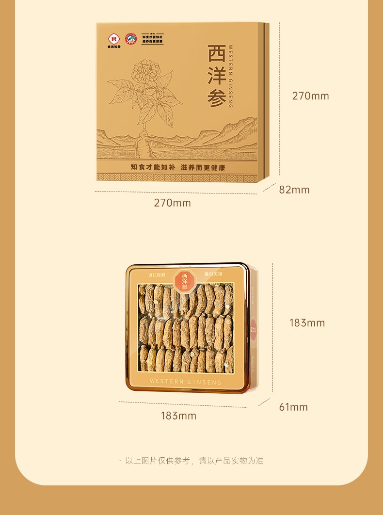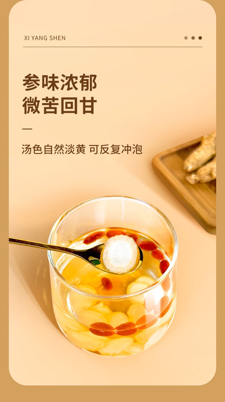 源自美国进口西洋参;皂苷含量高,参味浓郁,皮色偏深质地结实,肉质饱满,;手工甄选,无残人参,无农药残留