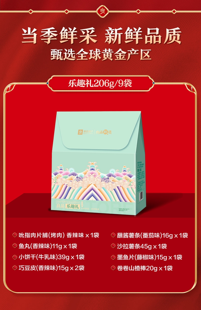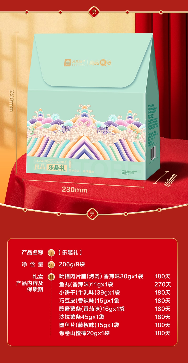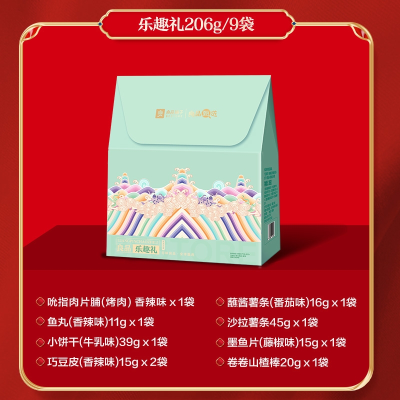 内配:高蛋白肉脯(香辣味)30g*1 鱼丸(香辣味)11g*1 牛乳风味小饼干39g*1 巧豆皮(香辣味)15g*2 蘸酱薯条(番茄味)16g*1 沙拉薯条(膨化食品)45g*1 墨鱼片(藤椒味)(膨化食品)15g*1 卷卷山楂棒20g*1