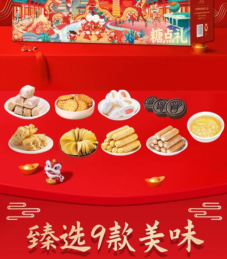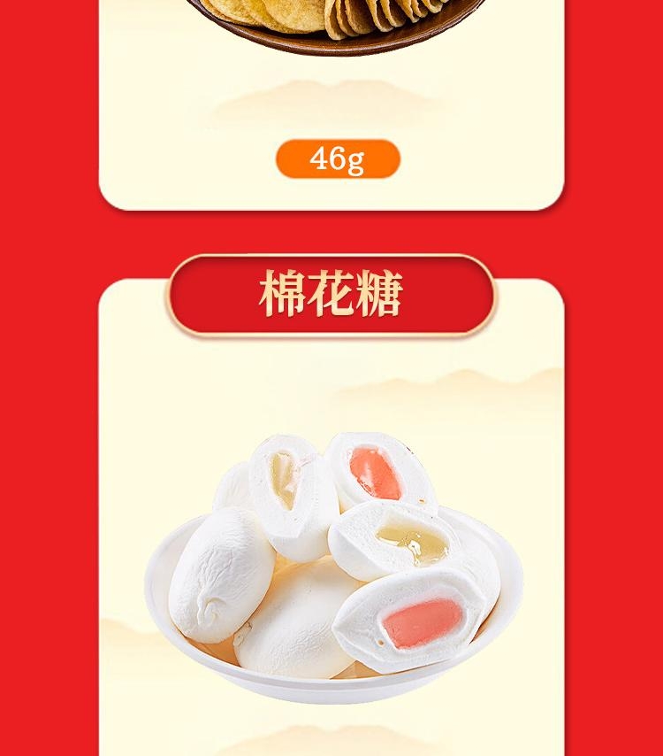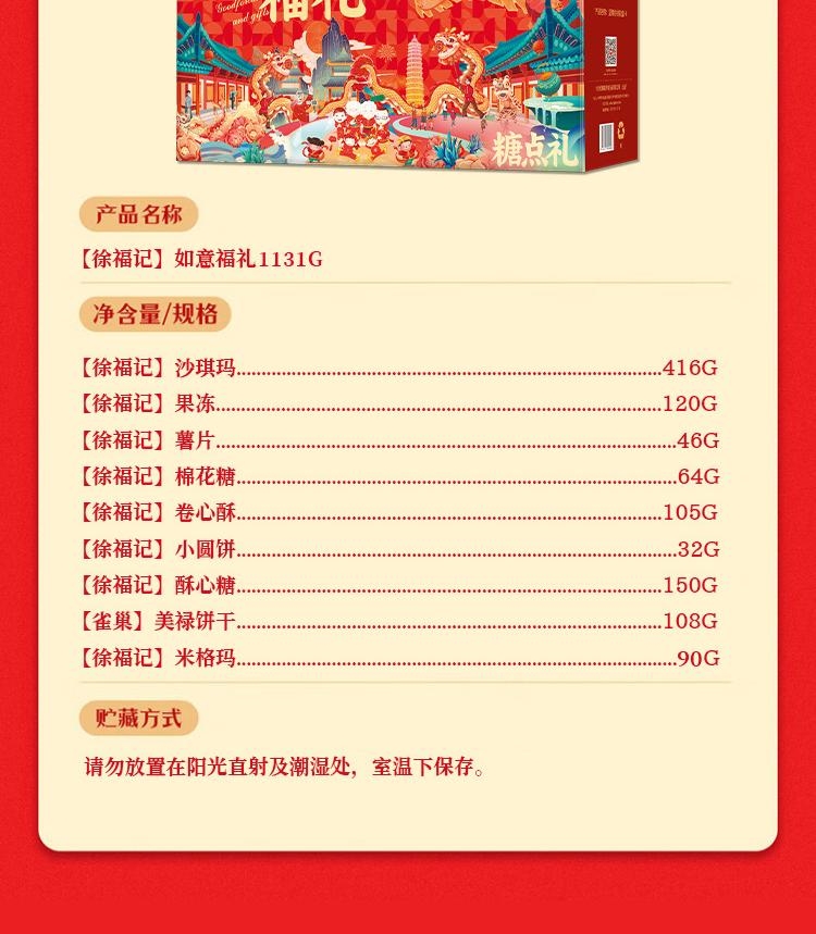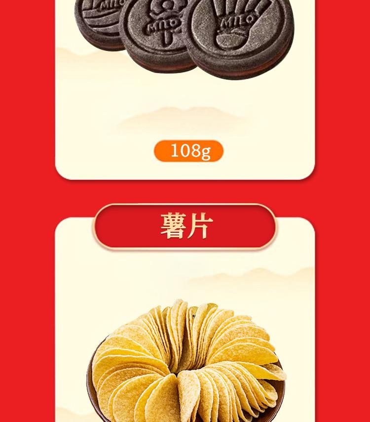 配置清单:【徐福记】沙琪玛416g【徐福记】果冻120g【徐福记】薯片46g 【徐福记】棉花糖64g【徐福记】卷心酥105g 【徐福记】小圆饼32g【徐福记】酥心糖150g 【雀巢美禄】饼干108g 【徐福记】米格玛90g
