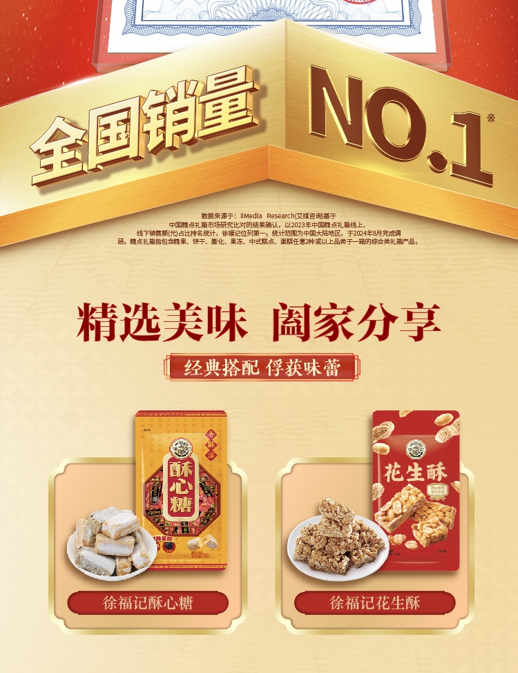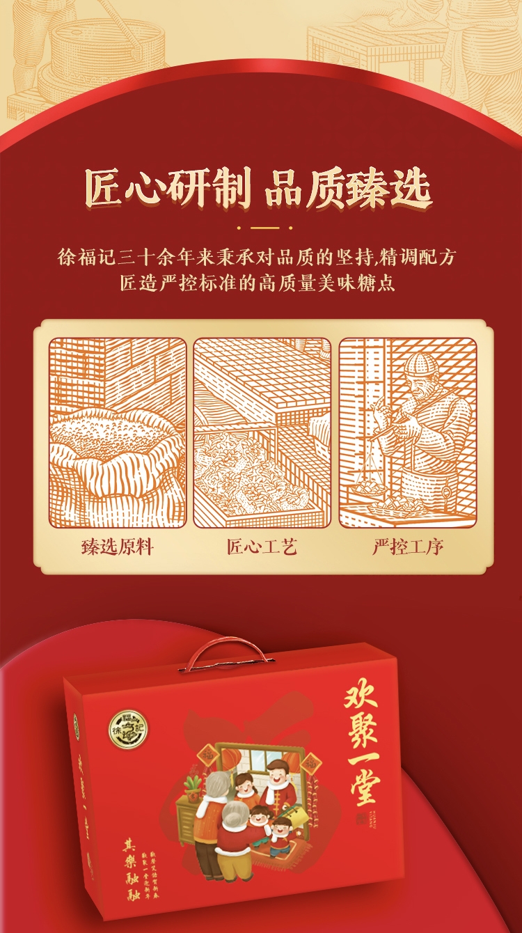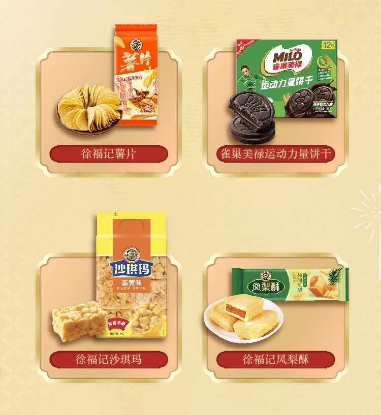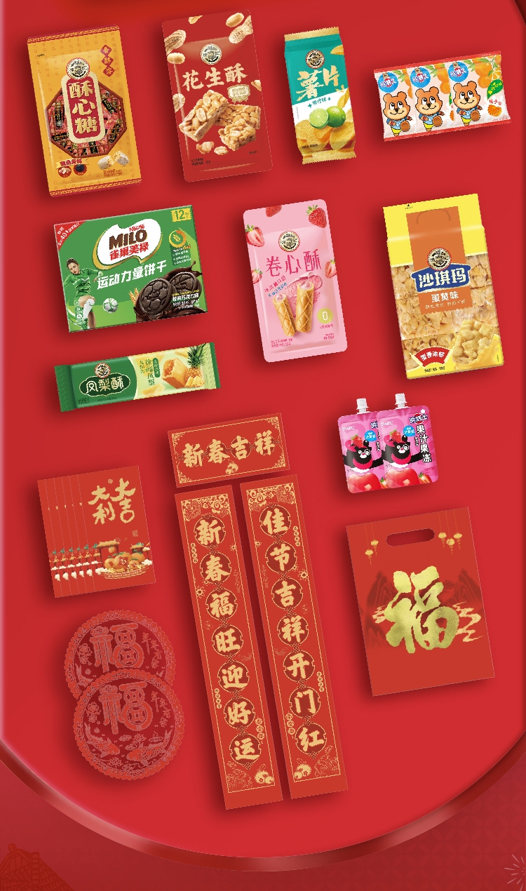 配置清单:徐福记酥心糖118g*1 徐福记花生酥105g*1 熊博士果汁软糖20g*3 雀巢美禄运动力量饼干108g*1 徐福记沙琪玛416g*1 徐福记凤梨酥69g*1 徐福记卷心酥125g*1 徐福记薯片40g*1 熊博士可吸果冻150g*2 赠送福袋(对联1副、红包6只、窗花1对)