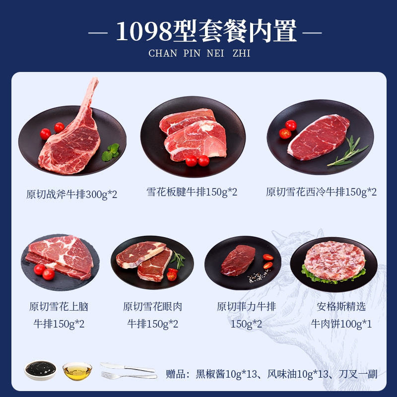 配置清单:澳洲精选谷饲原切战斧牛排300g*2 澳洲精选谷饲原切雪花板腱牛排150g*2 澳洲精选谷饲原切雪花西冷牛排150g*2 澳洲精选谷饲原切雪花上脑牛排150g*2 澳洲精选谷饲原切雪花眼肉牛排150g*2 澳洲精选谷饲原切菲力牛排150g*2 澳洲谷饲安格斯精选牛肉饼100g*1 黑椒酱10g*13 风味油10g*13 赠品:刀叉一副