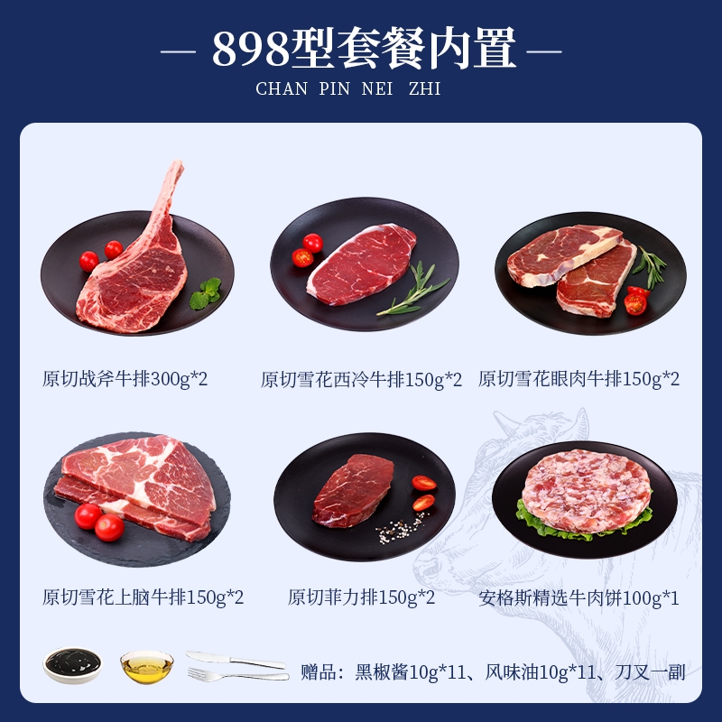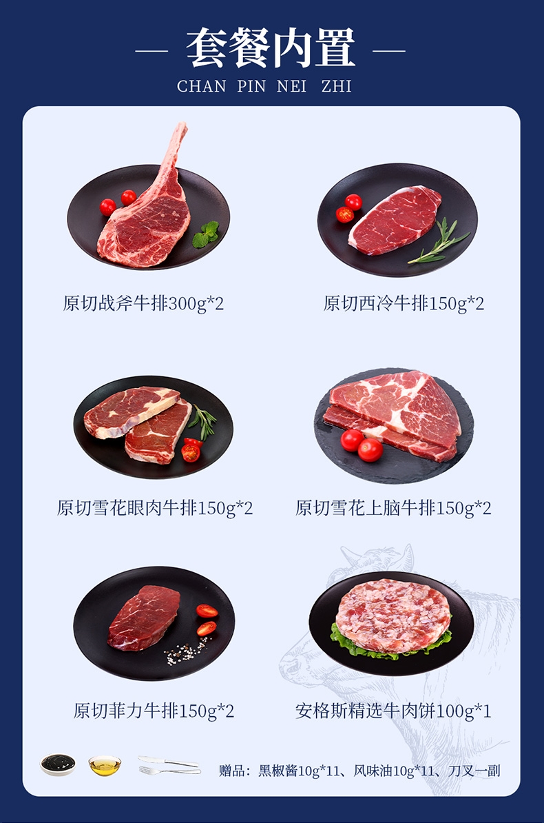 配置清单:澳洲精选谷饲原切战斧牛排300g*2 澳洲精选谷饲原切西冷牛排150g*2 澳洲精选谷饲原切雪花眼肉牛排150g*2 澳洲精选谷饲原切雪花上脑牛排150g*2 澳洲精选谷饲原切菲力牛排150g*2 澳洲谷饲安格斯精选牛肉饼100g*1 黑椒酱10g*11 风味油10g*11 赠品:刀叉一副