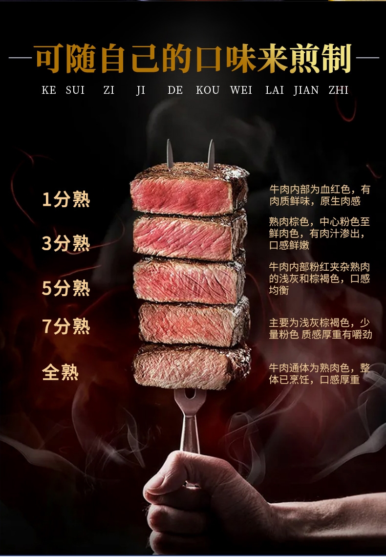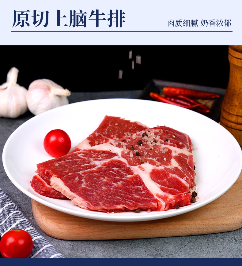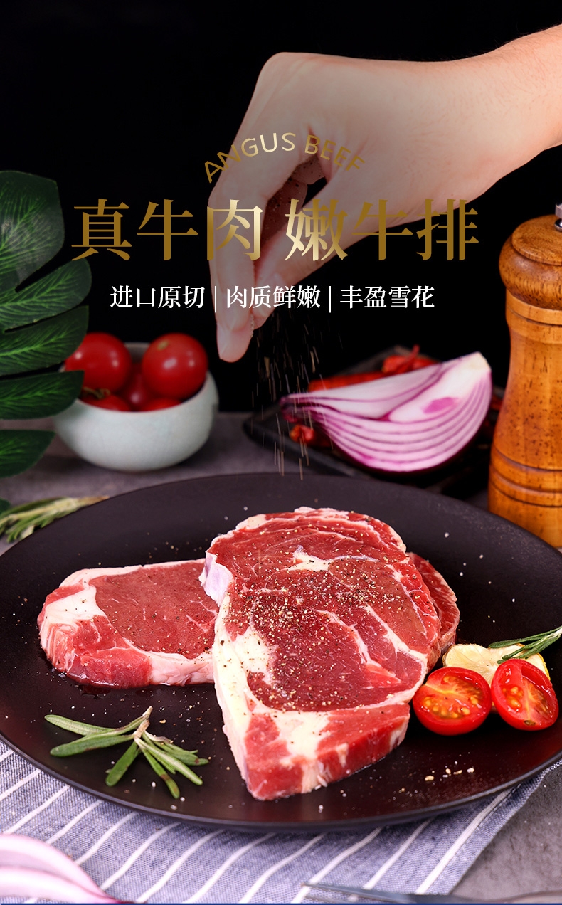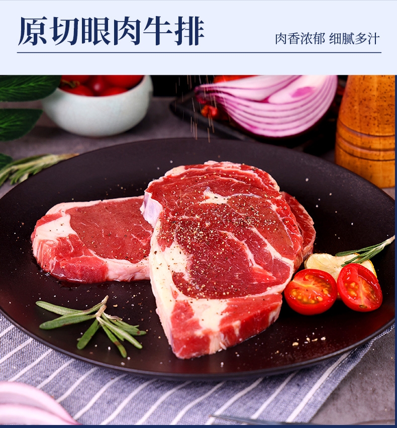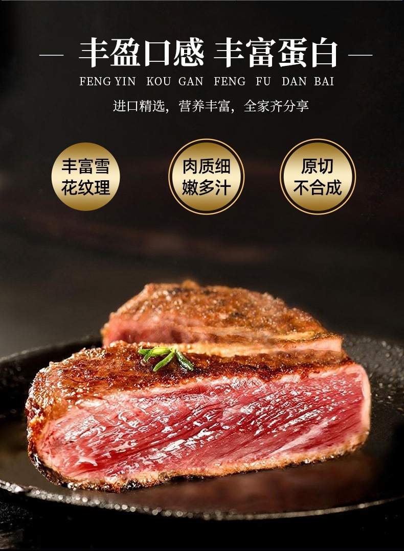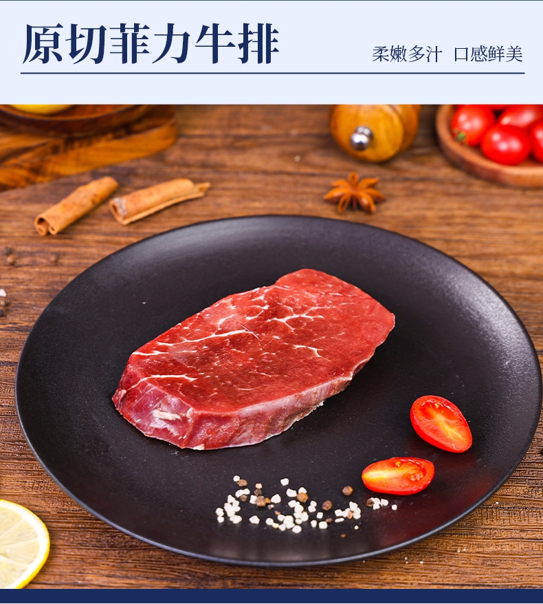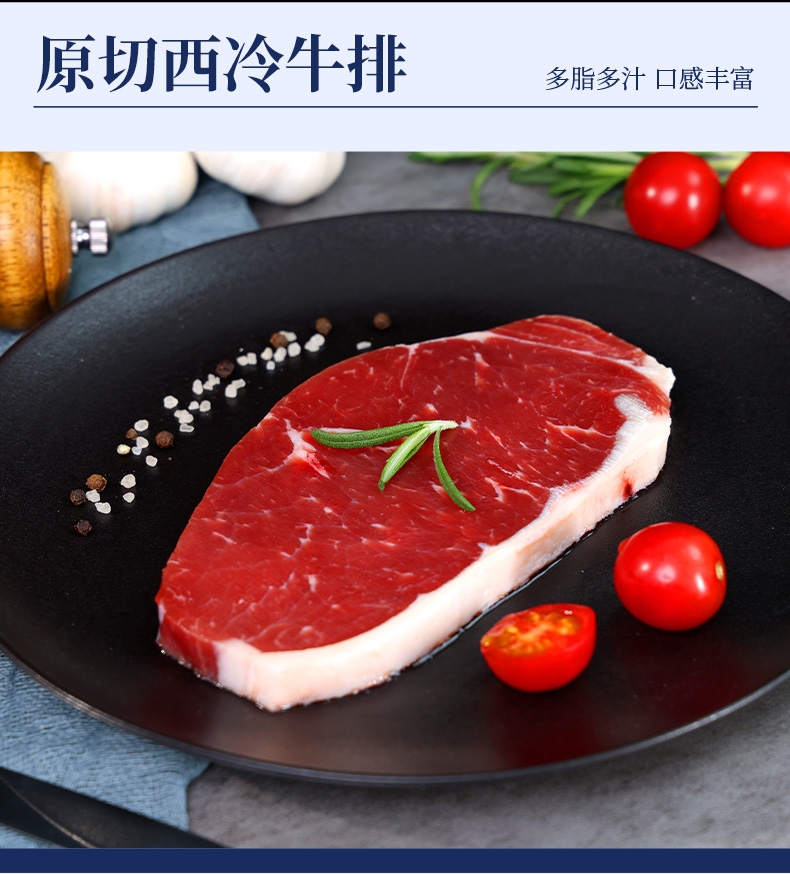 配置清单:澳洲精选谷饲原切西冷牛排150g*2 澳洲精选谷饲原切上脑牛排150g*2 澳洲精选谷饲原切眼肉牛排150g*2 澳洲精选谷饲原切菲力牛排150g*2 澳洲谷饲安格斯精选牛肉饼100g*1 黑椒酱10g*9 风味油10g*9 赠品:刀叉一副
