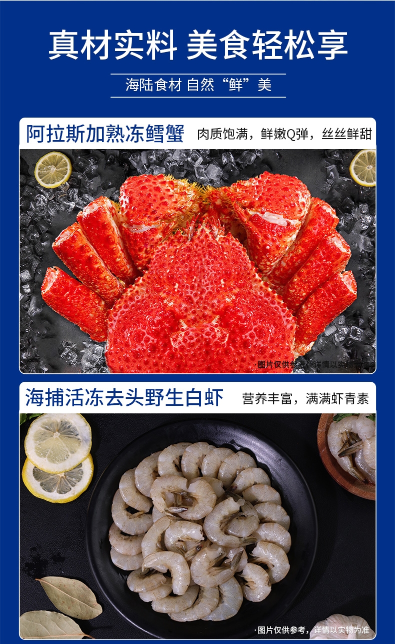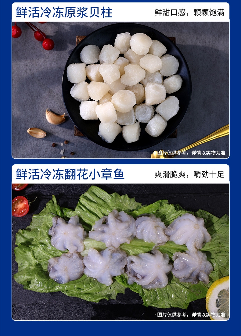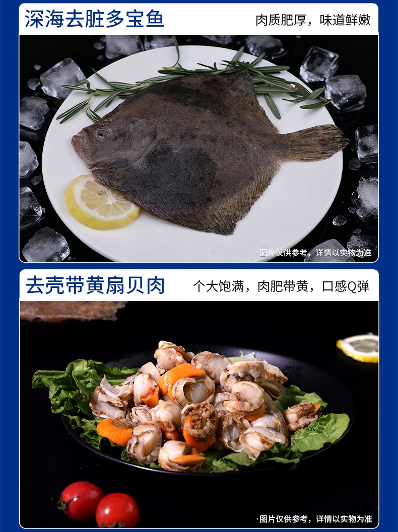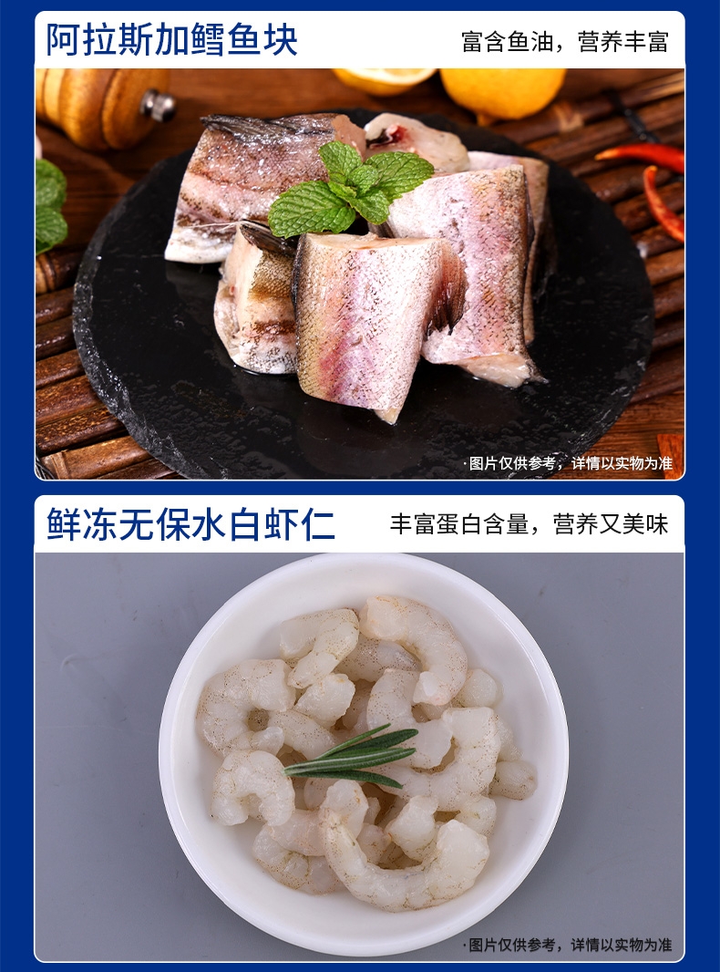配置清单:阿拉斯加熟冻鳕蟹300g-400g 海捕活冻去头野生白虾400g 鲜冻深海去脏多宝鱼250g-300g 冷冻去壳带黄扇贝肉300g 冷冻舟山小眼带鱼段500g 鲜冻海捕银鲳鱼500g 阿拉斯加鳕鱼块300g 鲜冻无保水白虾仁200g 鲜活冷冻原浆贝柱300g 鲜活冷冻翻花小章鱼300g