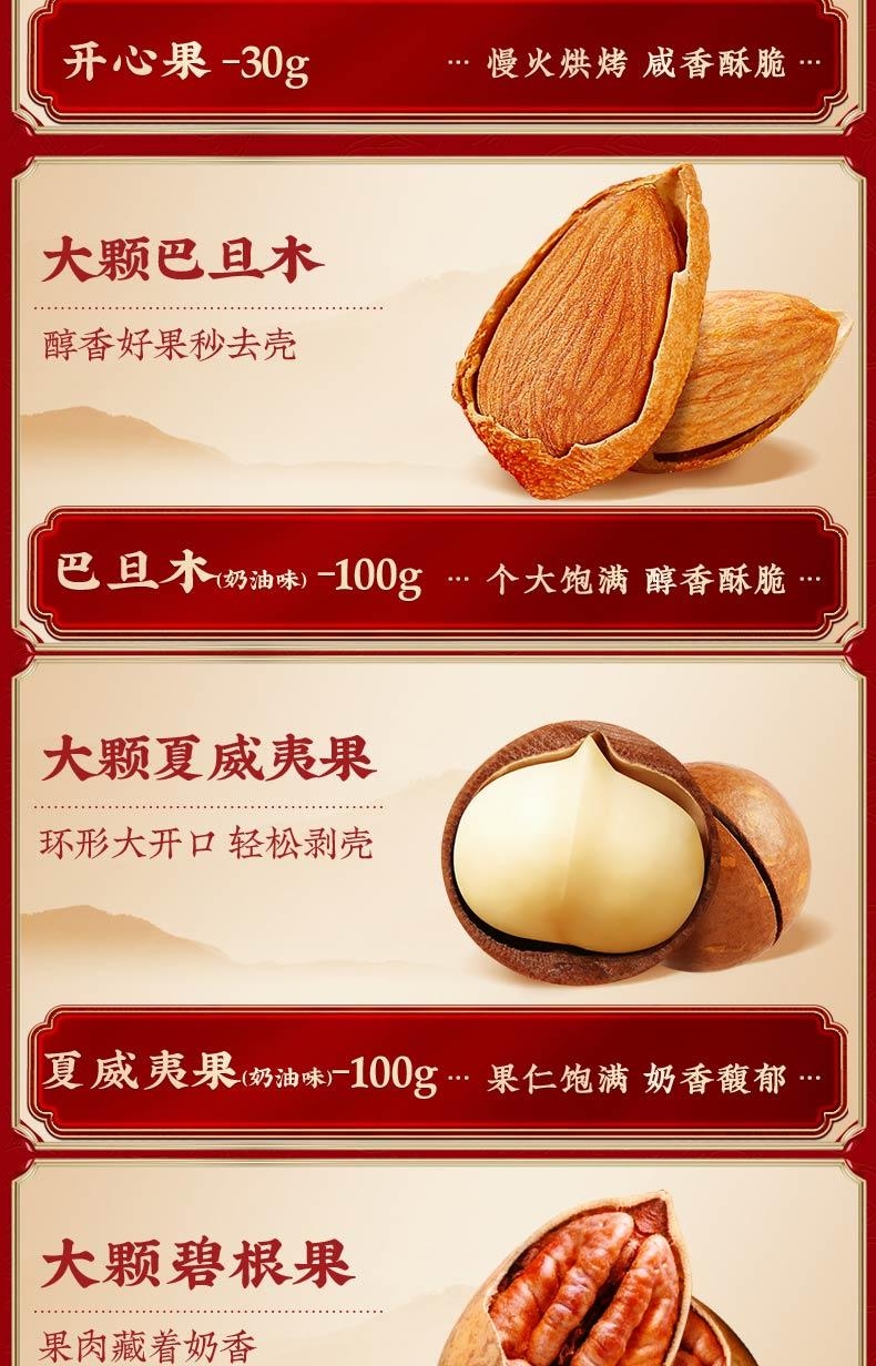 配置清单:【百草味】开心果30g 【百草味】巴旦木 100g 【百草味】夏威夷果100g 【百草味】碧根果 100g 【百草味】小白杏核 100g 【百草味】炭烧腰果 100g 【百草味】纸皮核桃 128g 【百草味】笑口板栗 120g 【百草味】爆汁卤花生228g 【百草味】蟹香蚕豆 180g 【百草味】山核桃仁小酥 210g 【百草味】蜀香麻辣牛肉60g 【百草味】鸭脖(甜辣味)65g 【百草味】果冻爽(葡萄味)150g 【百草味】蟹香瓜子仁 100g 【百草味】每日坚果乳 310g 【百草味】每日坚果乳 310g