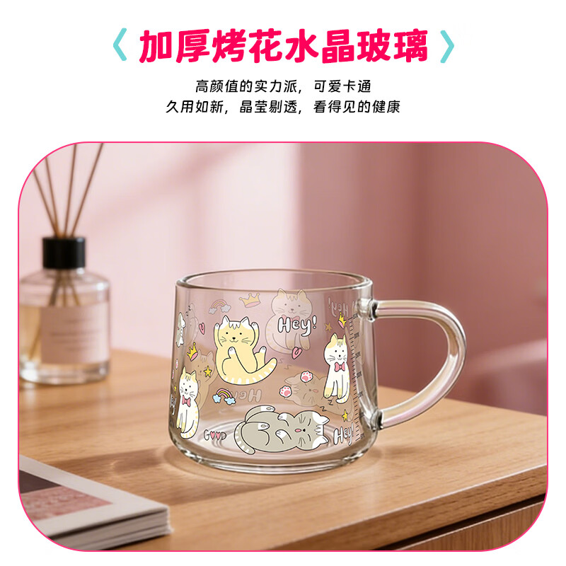 杯子由专业玻璃制造技术,100%纯净的水晶玻璃材质;杯体透明度高,杜绝细菌生长,杜绝污渍和异味;杯身高温烤花工艺,美观时尚,适用于多种液体饮品