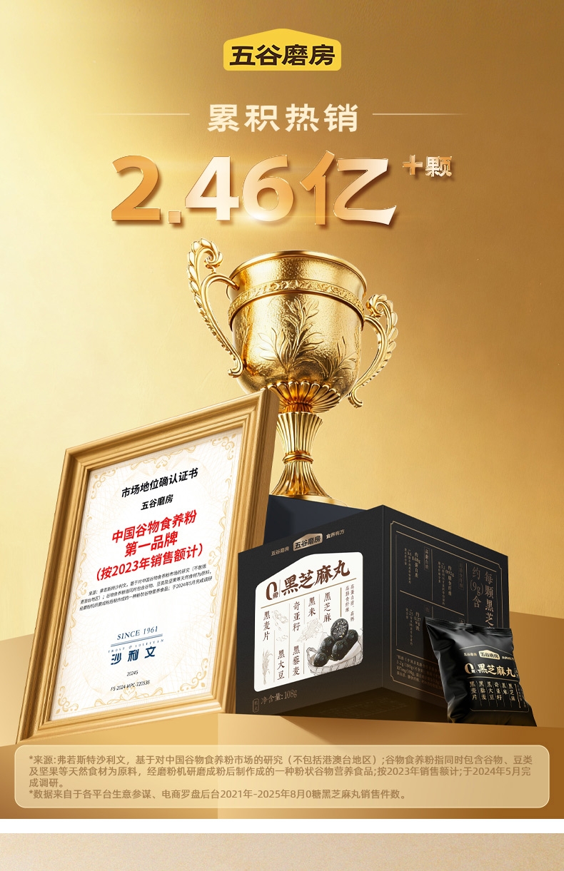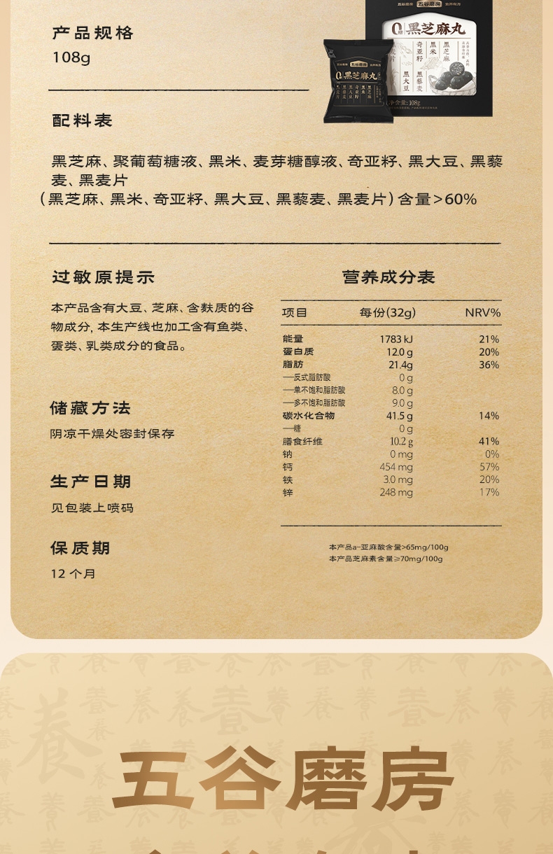 配置清单:五谷磨房-黑芝麻丸108g(无糖) 注:有黑色和红色两款,条码不同。下单请注意。