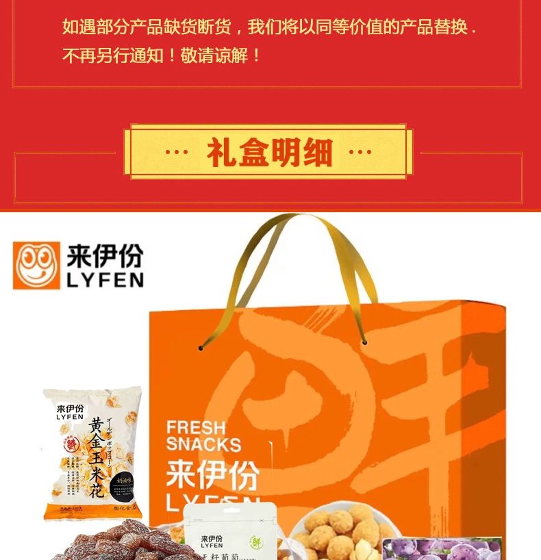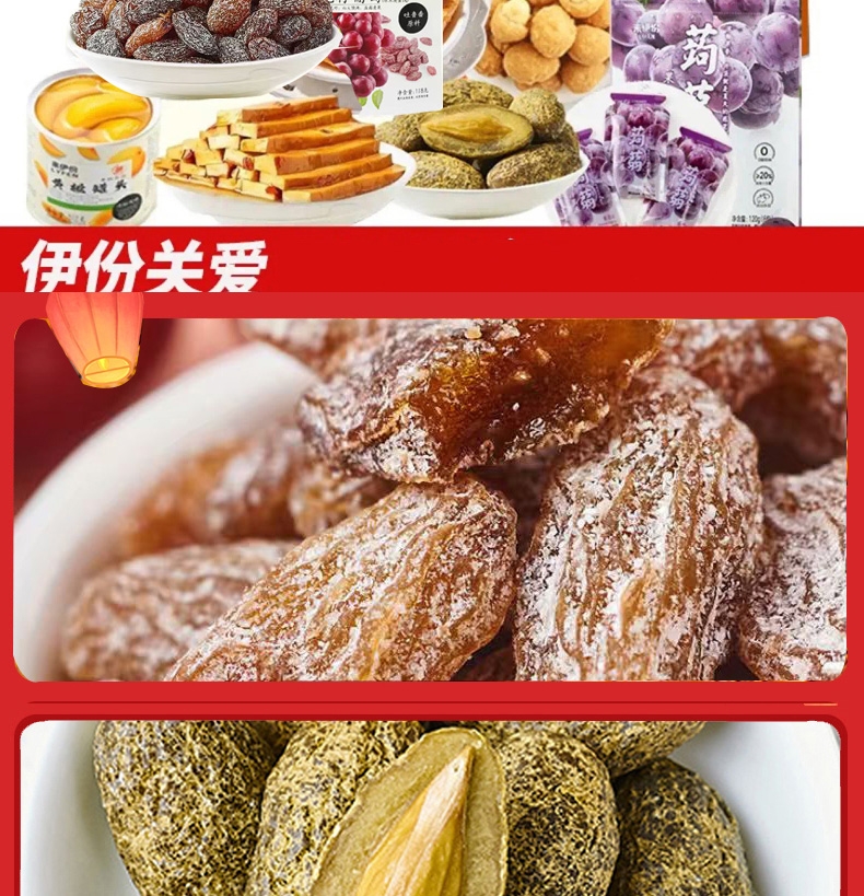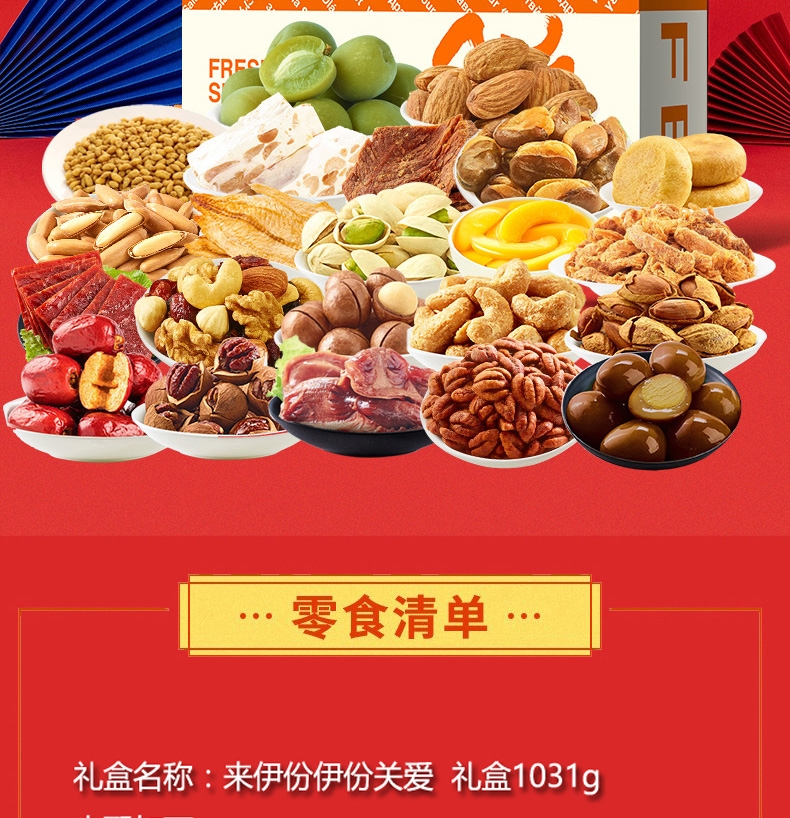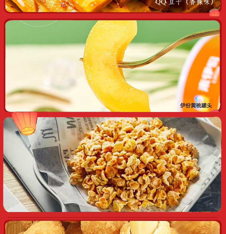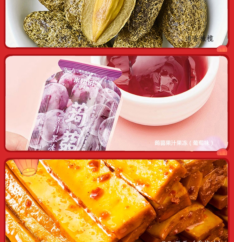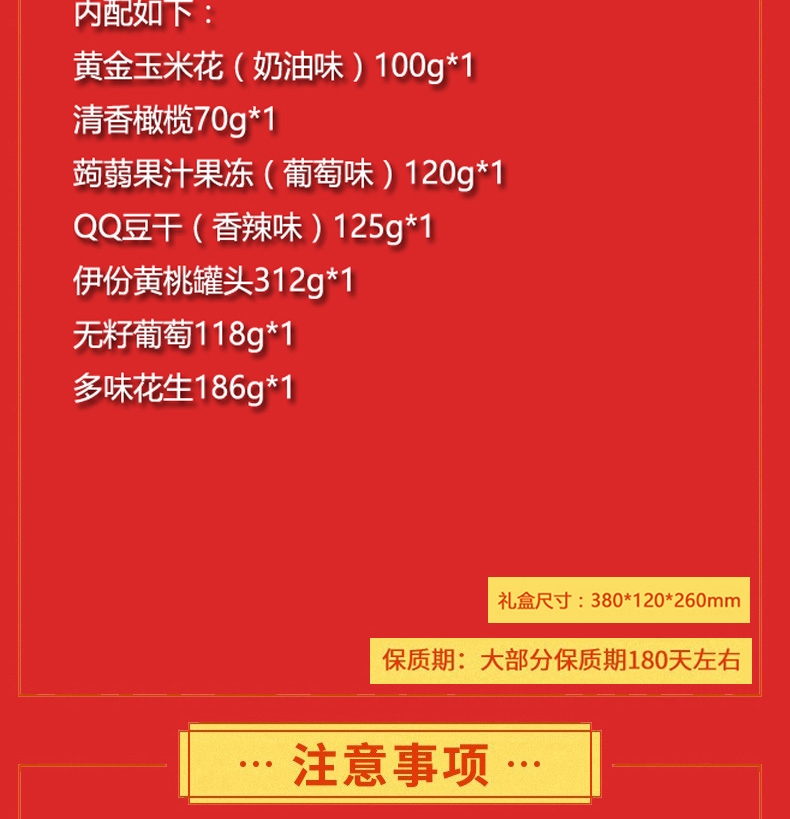 配置:黄金玉米花(奶油味)100g*1 清香橄榄70g*1 蒟蒻果汁果冻(葡萄味)120g*1 QQ豆干(香辣味)125g*1 伊份黄桃罐头312g*1 无籽葡萄118g*1 多味花生186g*1
