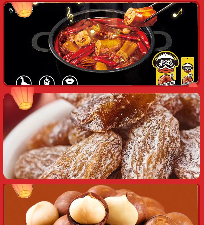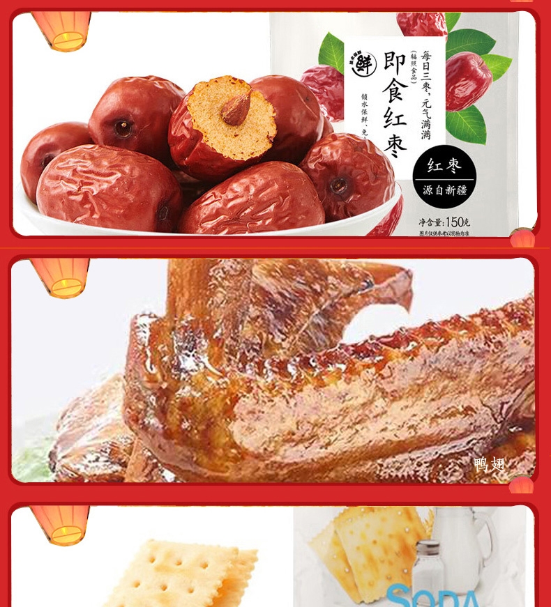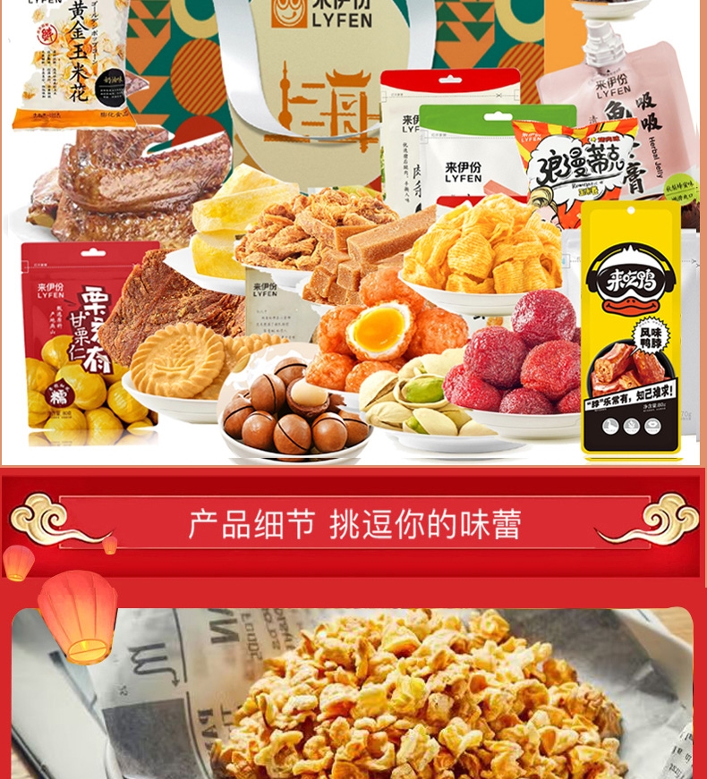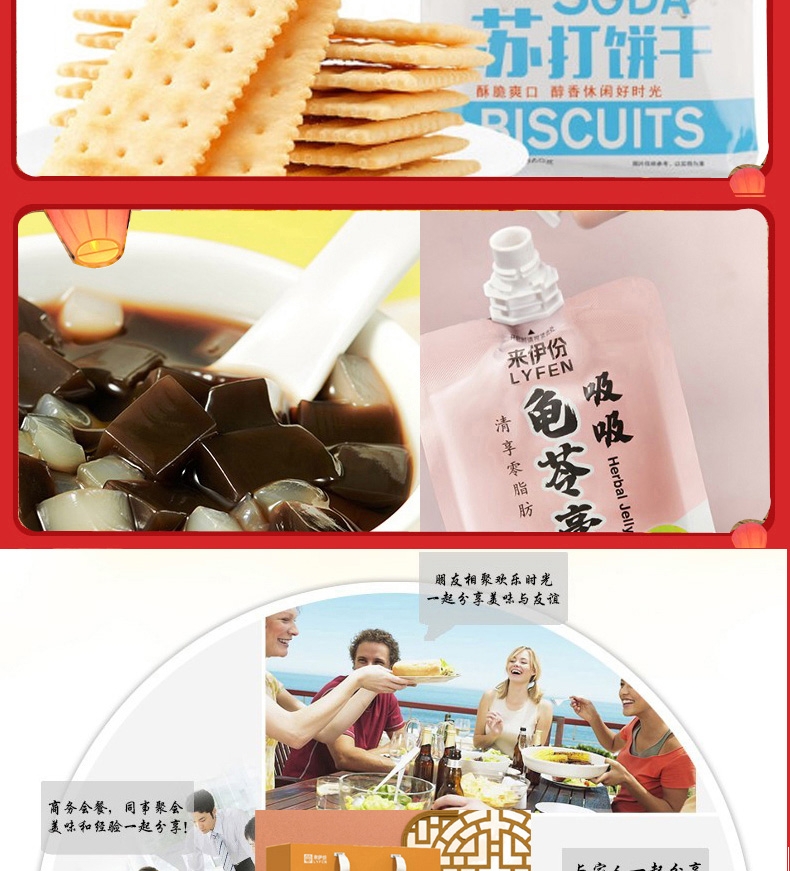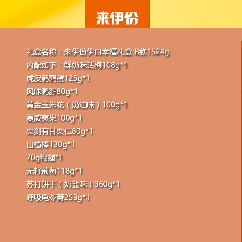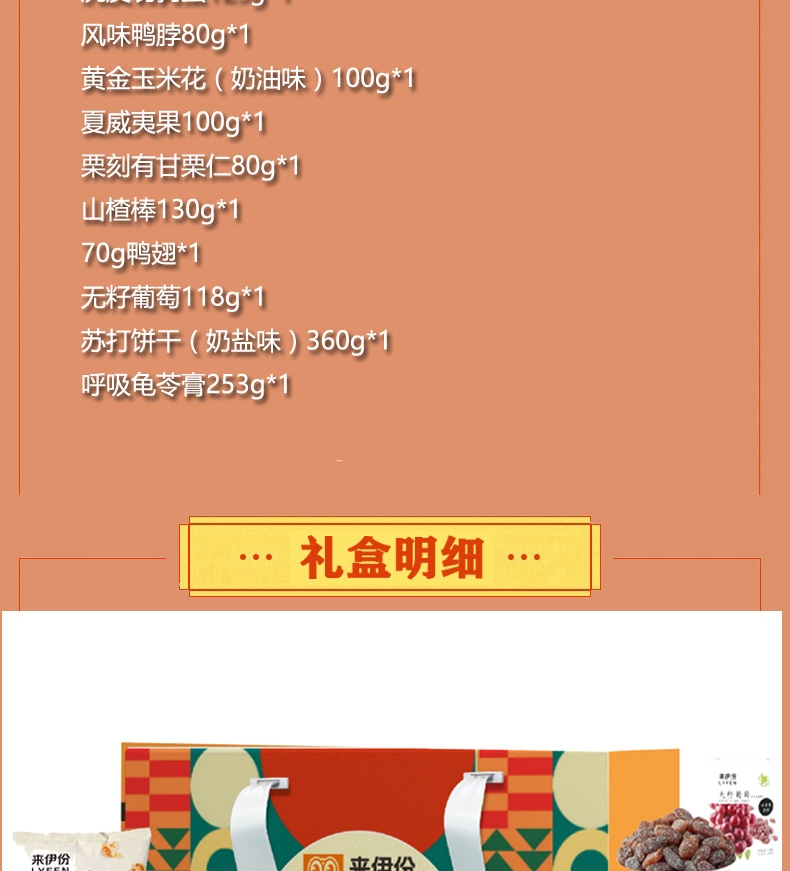 配置:鲜奶味话梅108g*1 虎皮鹌鹑蛋125g*1 风味鸭脖80g*1 黄金玉米花(奶油味)100g*1 夏威夷果100g*1 栗刻有甘栗仁80g*1 山楂棒130g*1 70g鸭翅*1 无籽葡萄118g*1 苏打饼干(奶盐味)360g*1 呼吸龟苓膏253g*1