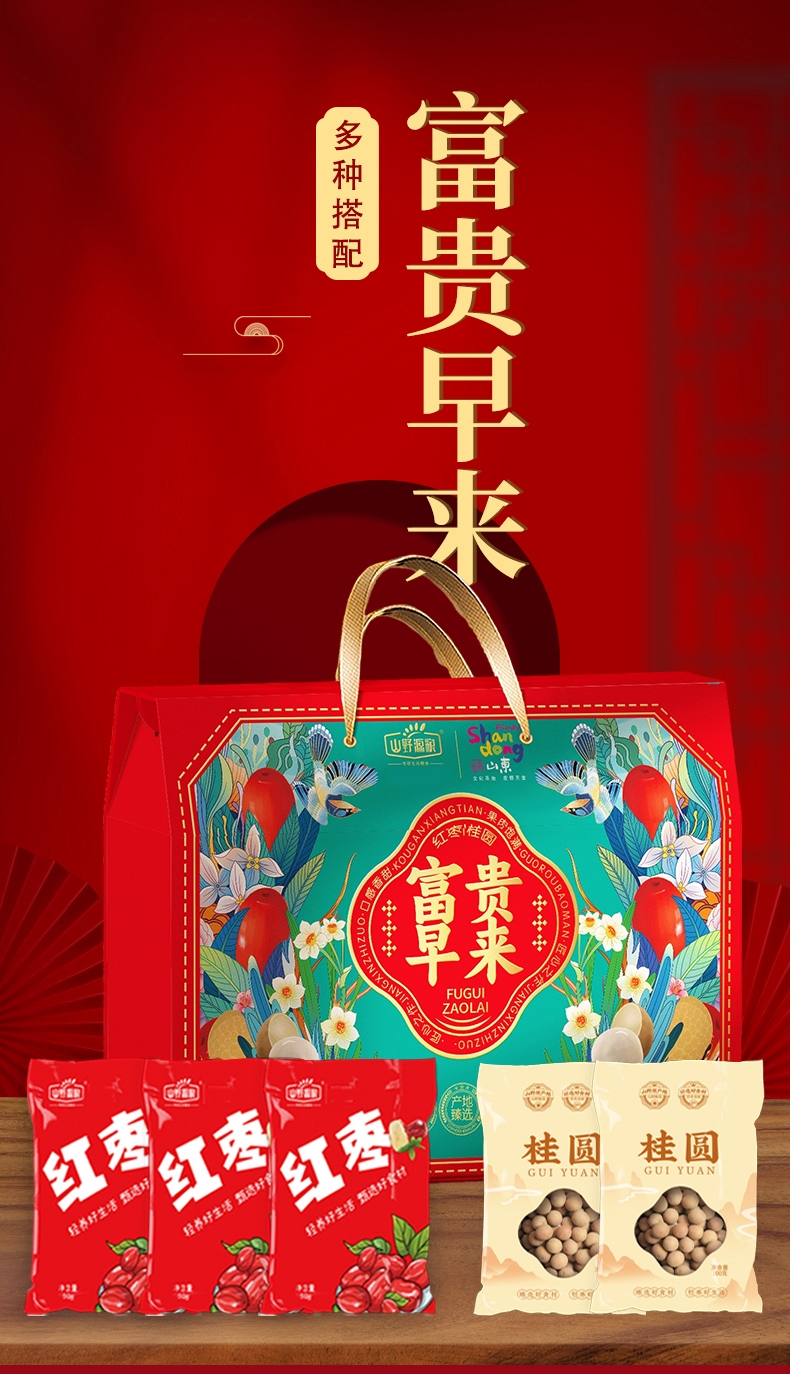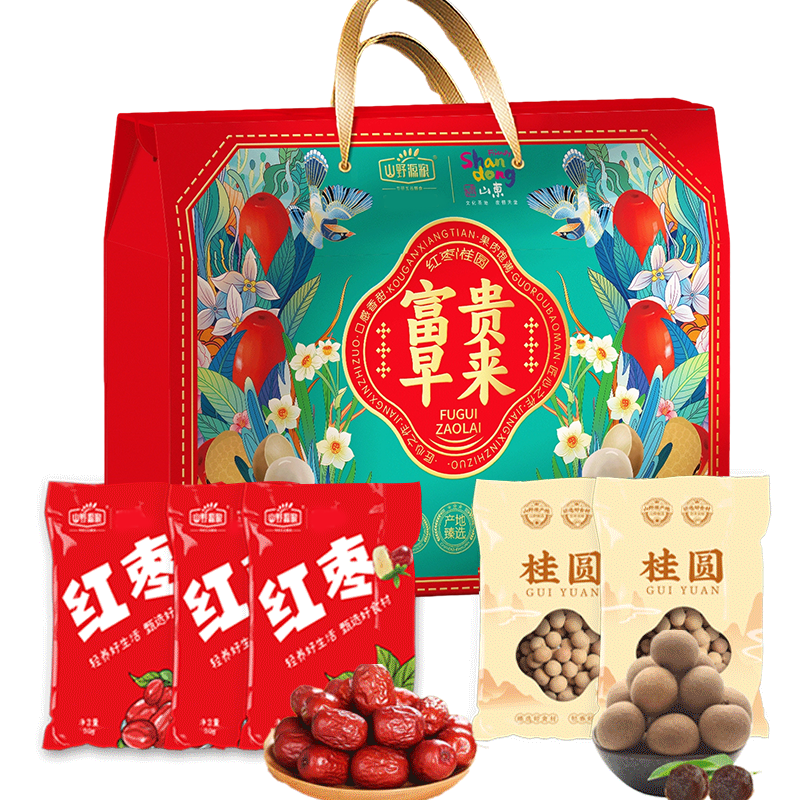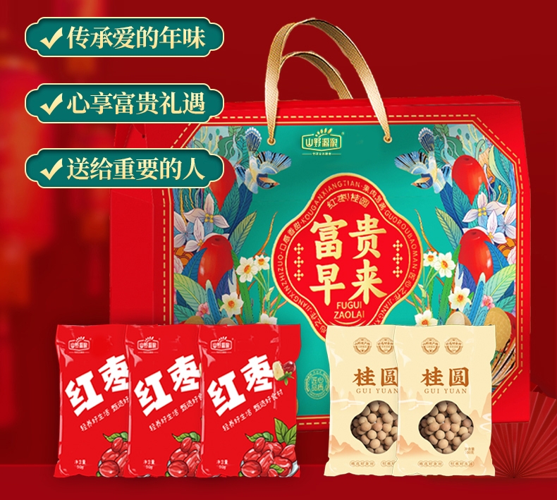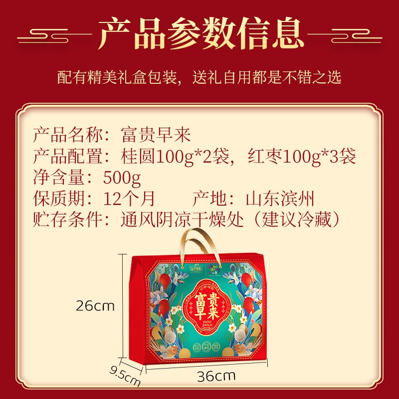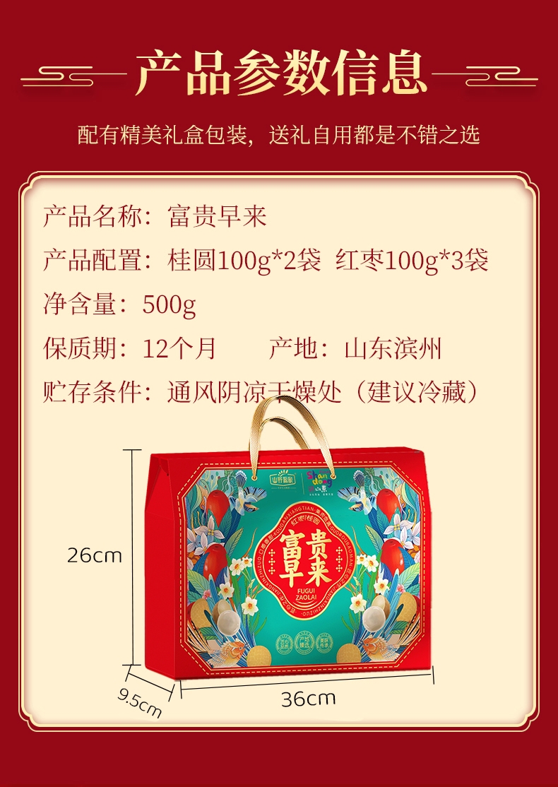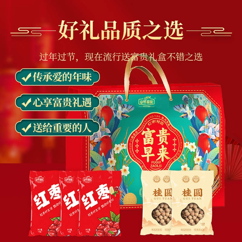 红枣+桂圆搭配组合;吉祥画面设计寓意美好;礼盒超大气,送礼有面子