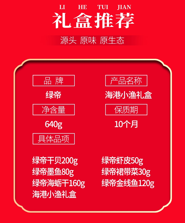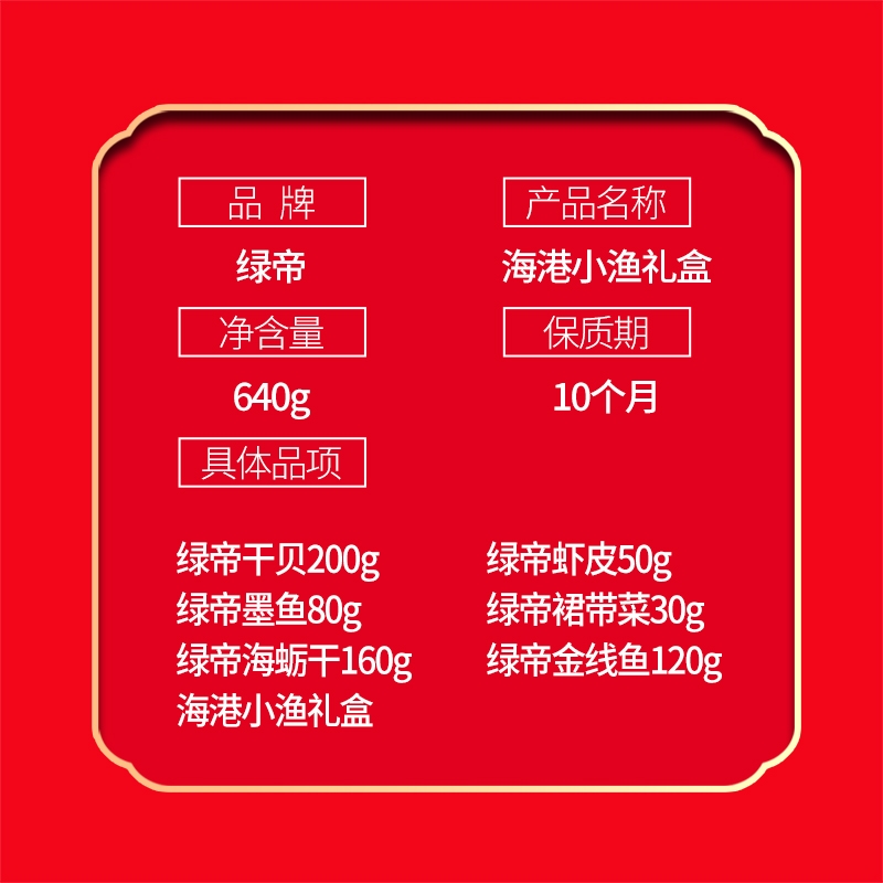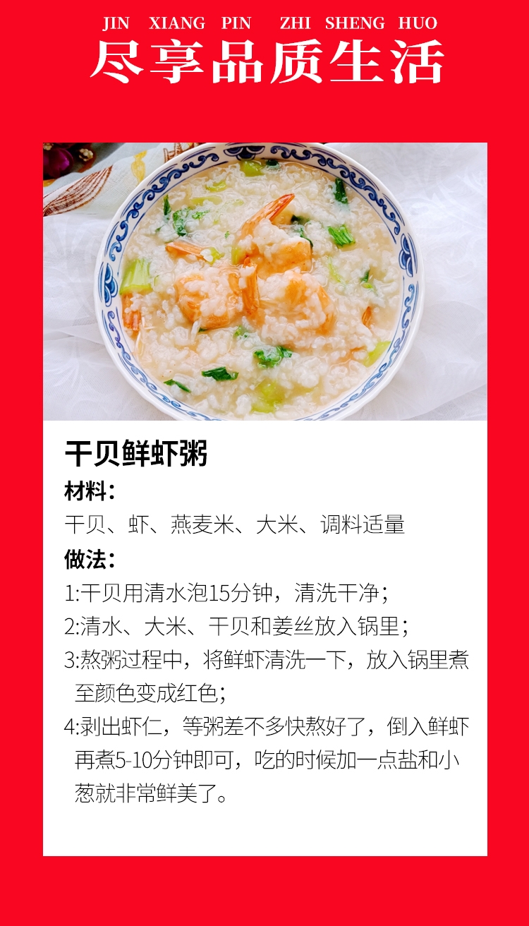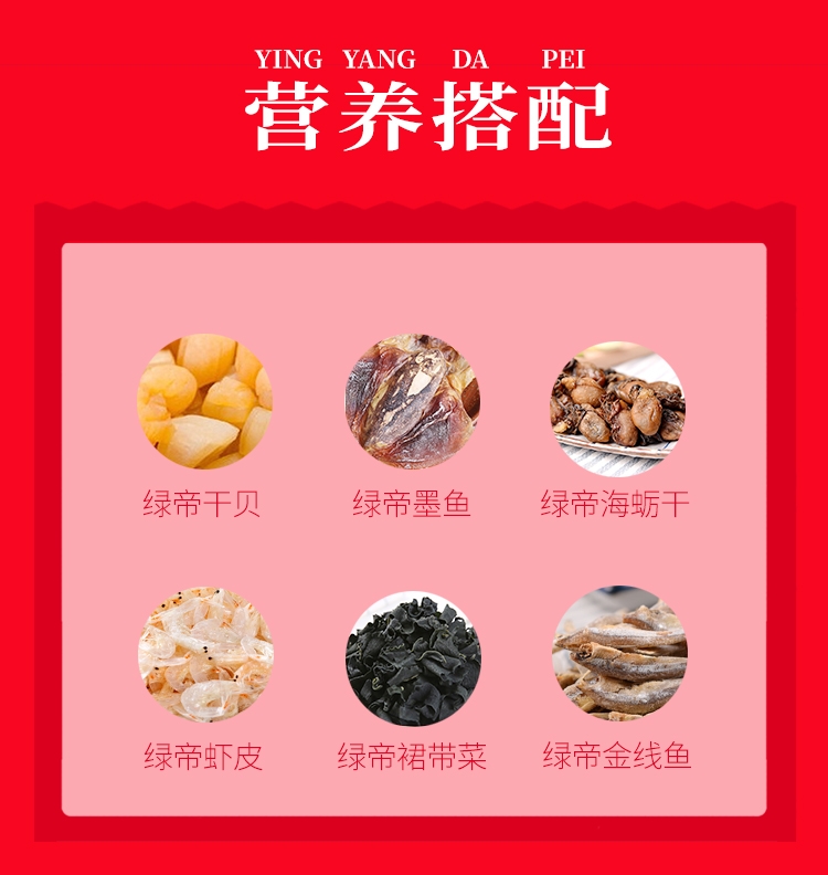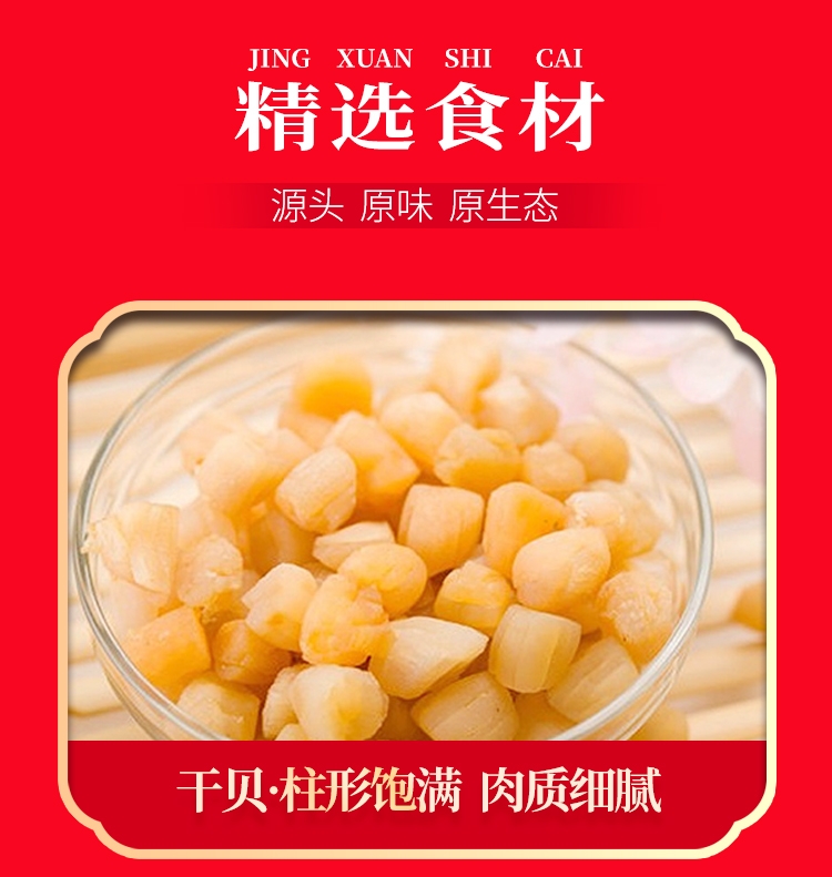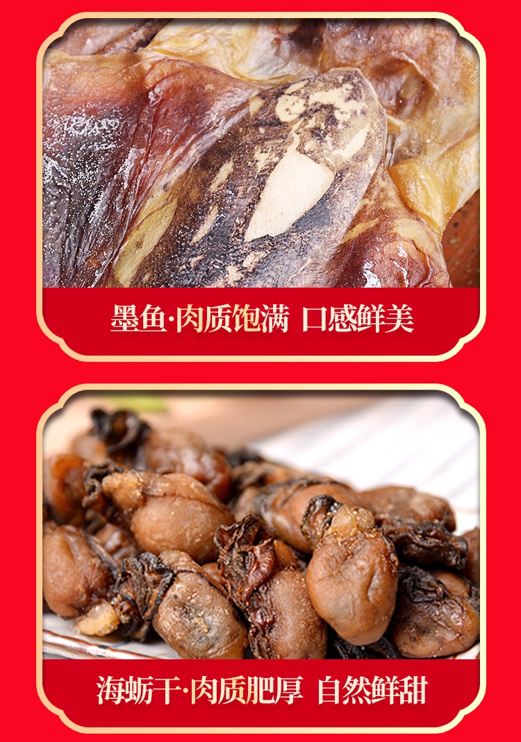 配置:虾皮50g 墨鱼80g 金线鱼120g 干贝200g 裙带菜30g 海蛎干160g