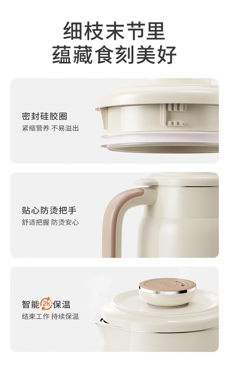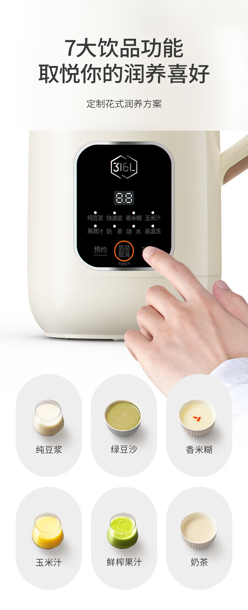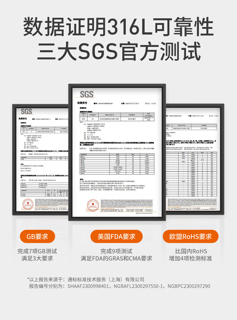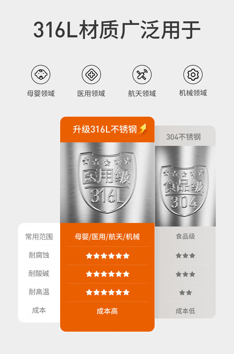 316L医用级,健康不锈钢内胆; 4、低音轻噪,噪音低至48dB;小体积,精巧易收纳