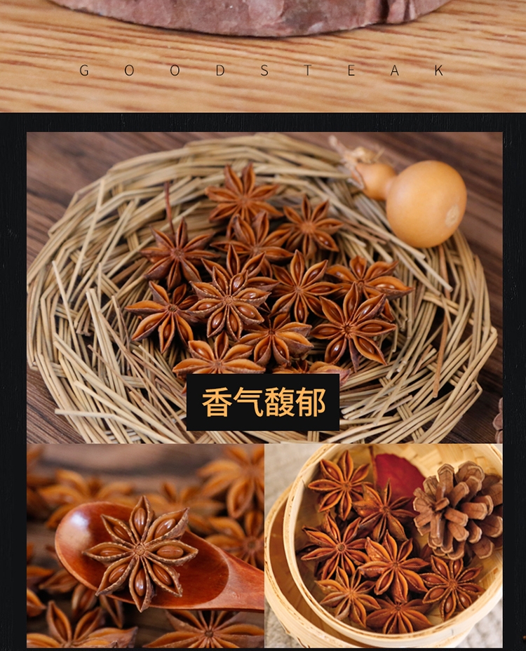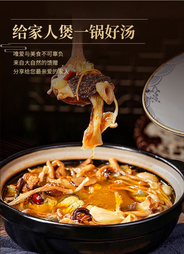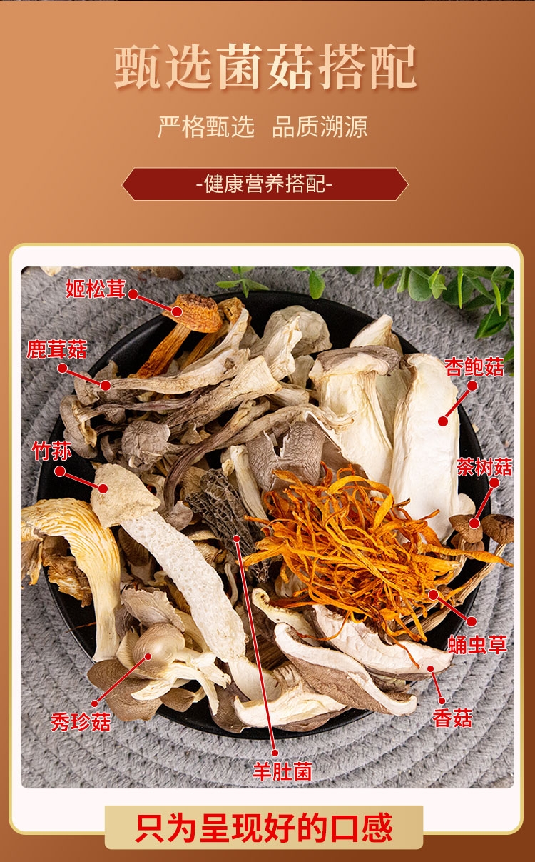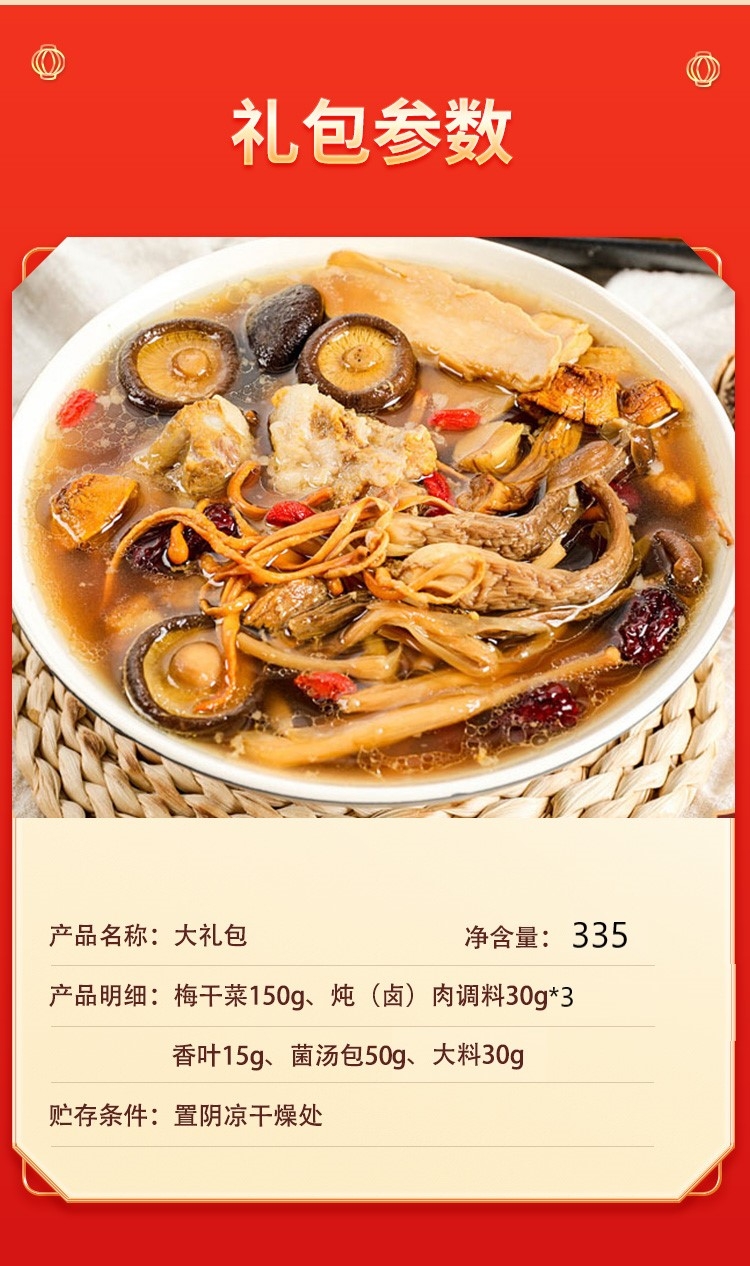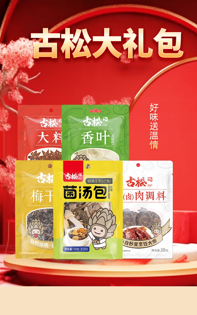 配置清单:古松梅干菜150g 古松炖(卤)肉调料30g*3 古松大料30g 古松香叶15g 古松菌汤包50g