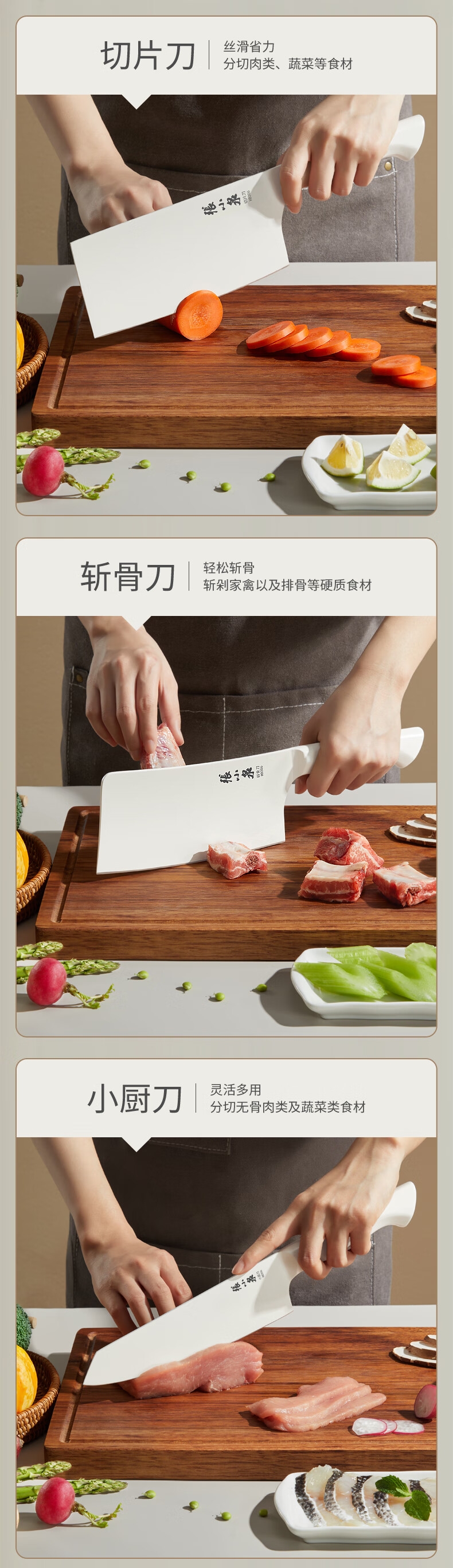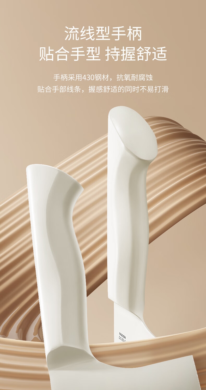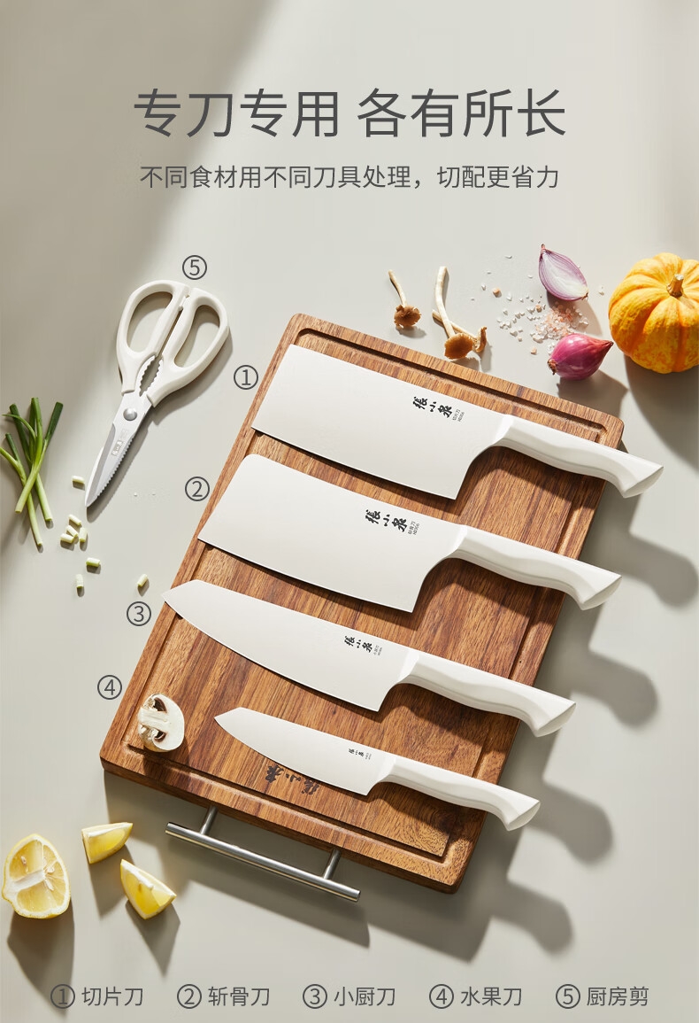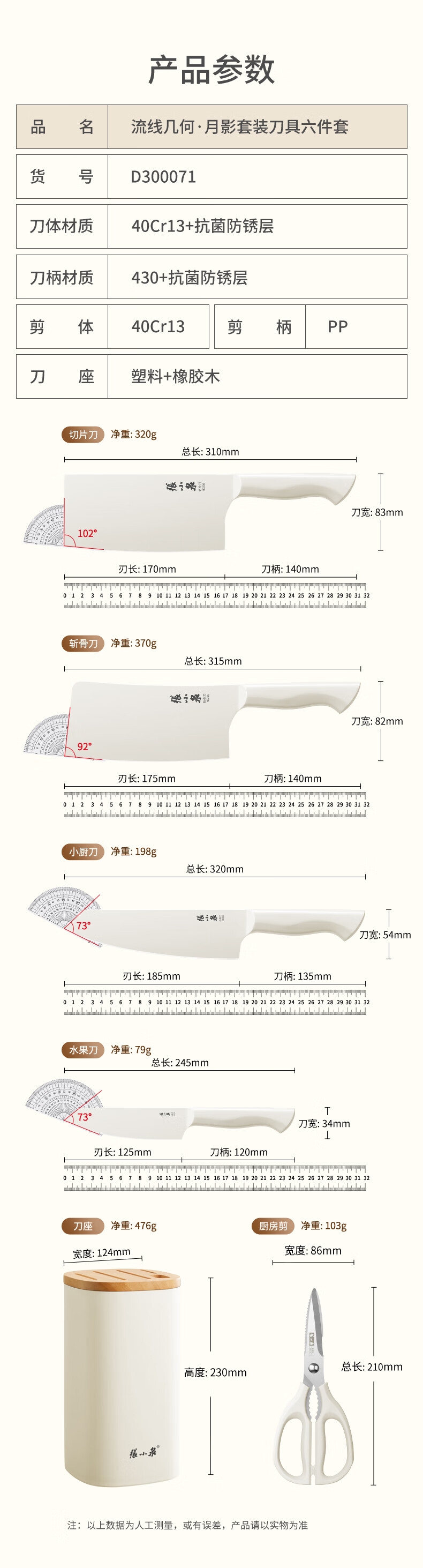 明细:砍骨刀、切片刀、小厨刀、水果刀、剪刀、刀座;刀身采用40cr13钢材,搭配CVD抗菌层;流线型手柄,贴合手型,精磨抛光握感更舒适