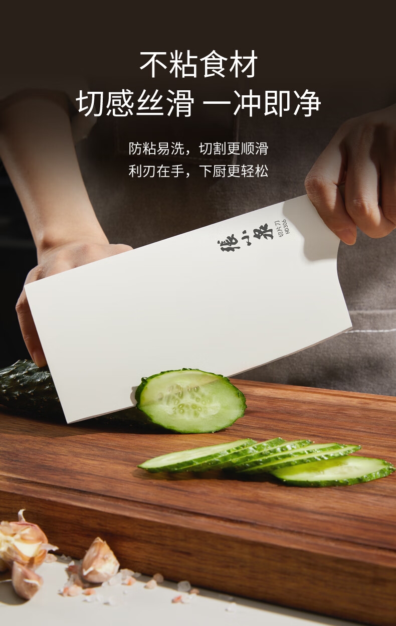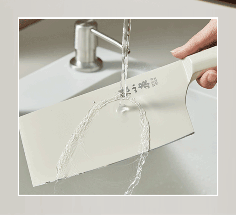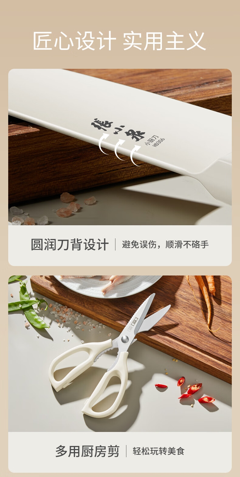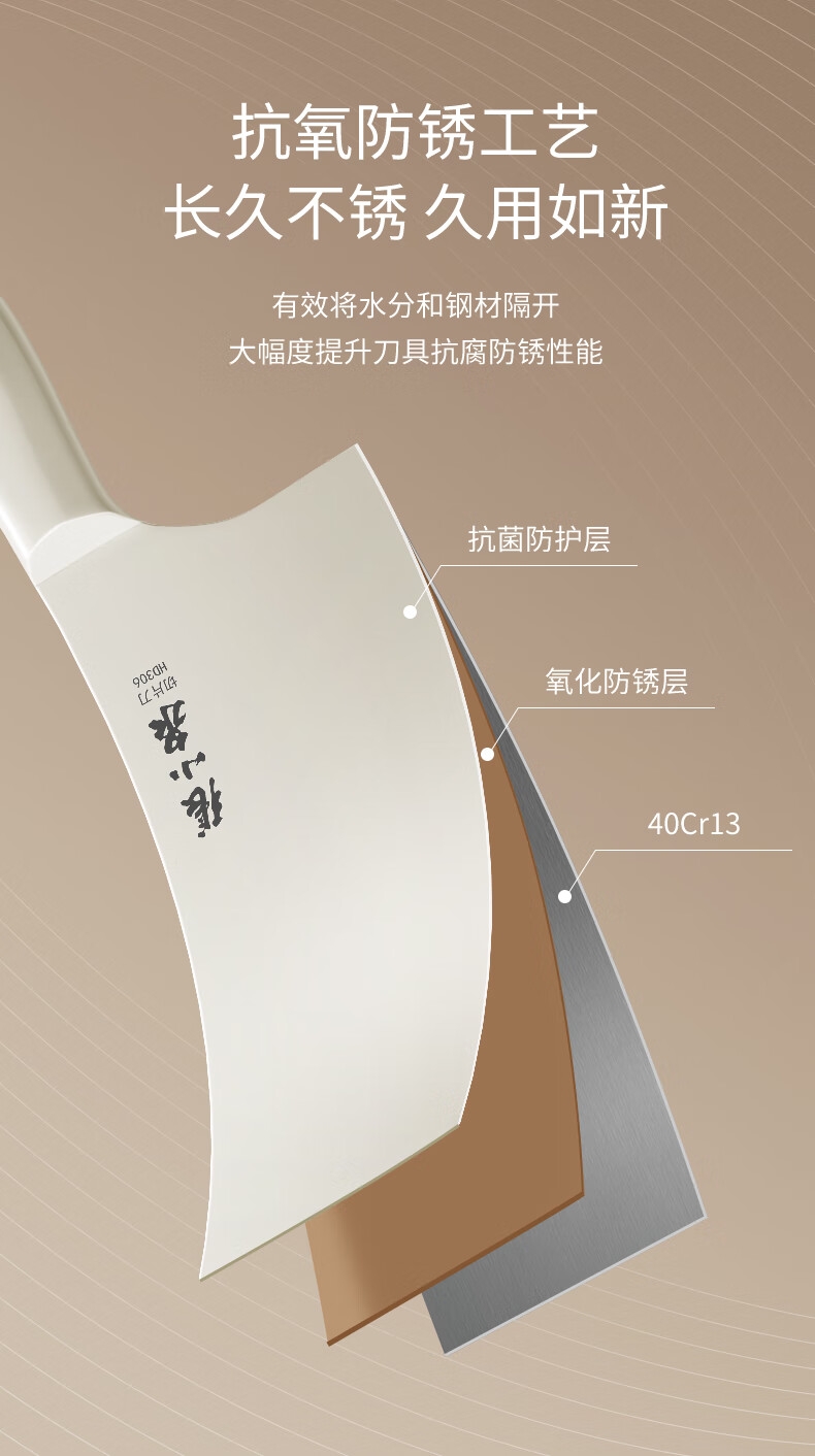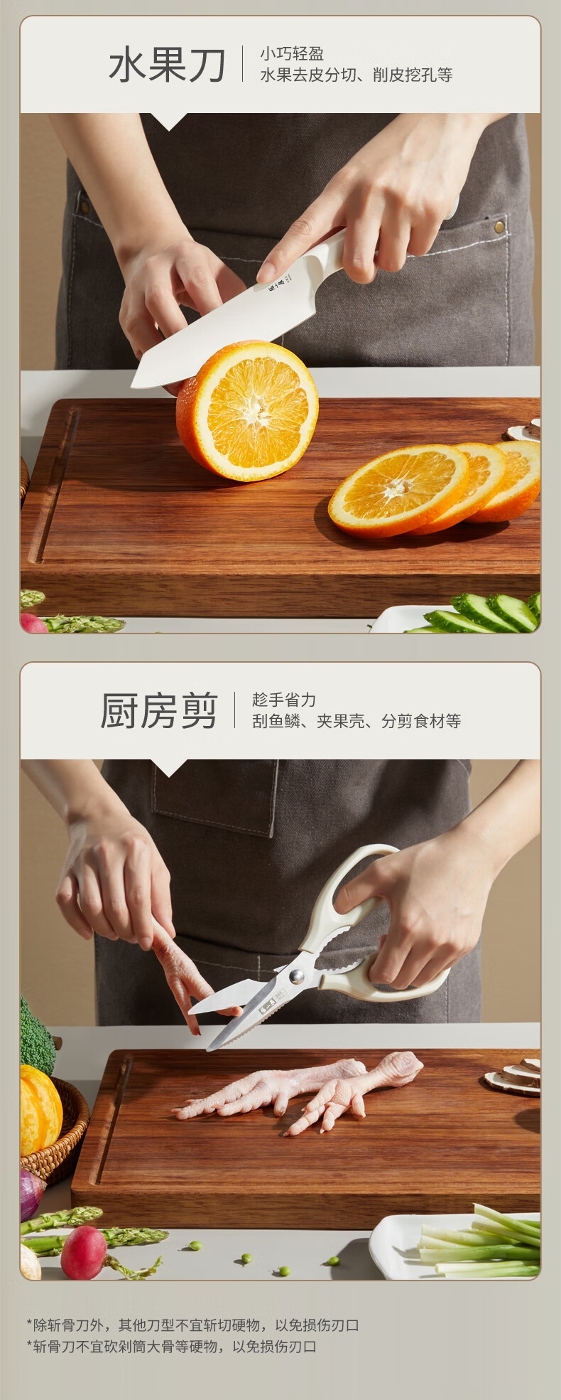 明细:砍骨刀、切片刀、小厨刀、水果刀、剪刀、刀座;刀身采用40cr13钢材,搭配CVD抗菌层;流线型手柄,贴合手型,精磨抛光握感更舒适