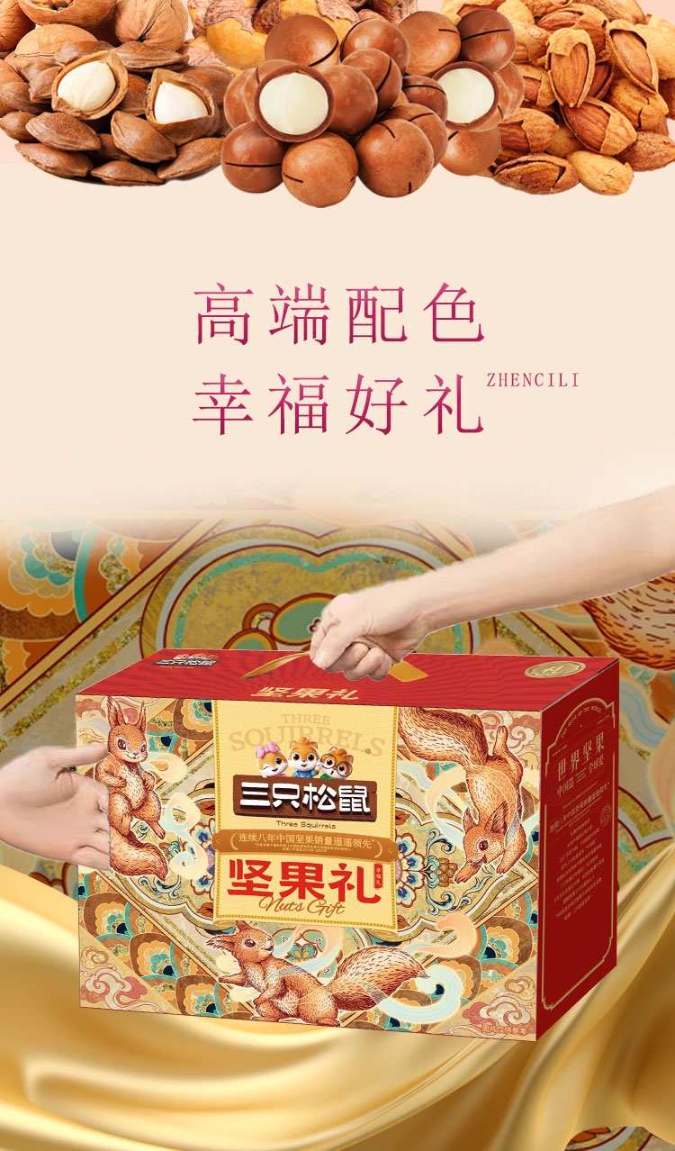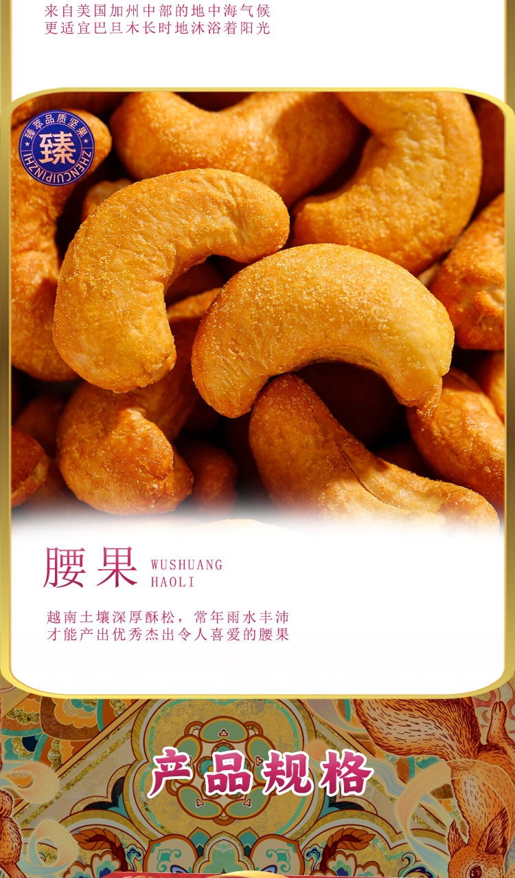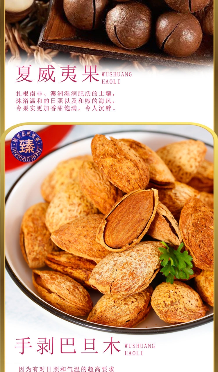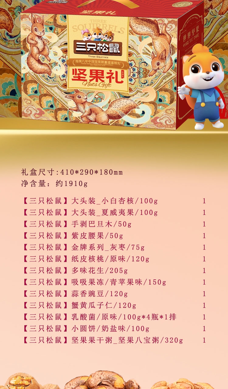 配置清单:大头装腰果蟹黄味120g(坚果礼专供) 大头装夏威夷果120g(坚果礼专供) 中袋装手剥巴旦木50g 中袋装手剥巴旦木50g 森林坚果-小白杏核80g 中袋装_纸皮核桃原味120g 森林坚果-多味花生120g 森林坚果-蒜香豌豆120g 中袋装兰花豆牛肉味205g 中袋香瓜子 150g 坚果莲子八宝粥320g 山药脆片山药脆片番茄味60g 小圆饼100g 饮料坚果乳240ml