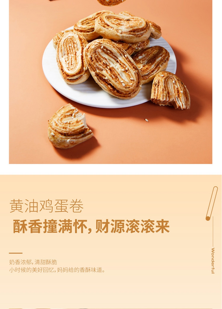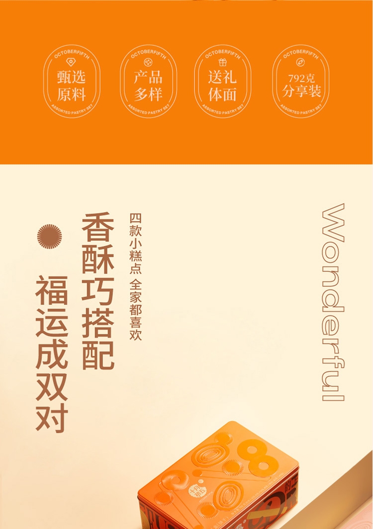 配置清单:1、十月初五13g海风椰丝西饼X12小包 2、十月初五13g芝士果仁酥X12小包 3、十月初五18g葱香鲍鱼酥X10小包 4、十月初五30g黄油鸡蛋卷X10小包 橙色、发货。