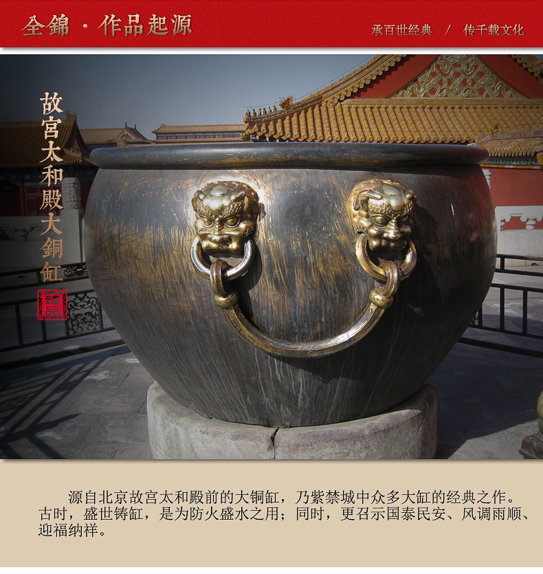 源自太和殿前的大铜缸,乃紫禁城中众多大缸的经典之;古时,盛世铸缸,召示国泰民安,风调雨顺;以琉璃和贵金属高档材质,采用精湛铸造与雕刻技艺而成